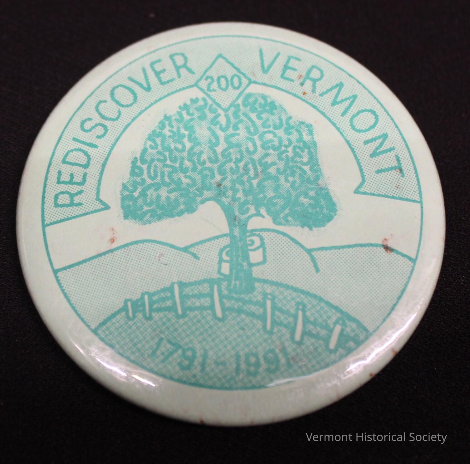 Promotional button printed in green with an image of a tree on a hill and the words, "REDISCOVER VERMONT / 200 / 1971-1991". There are two sap buckets attached to the tree,.Context