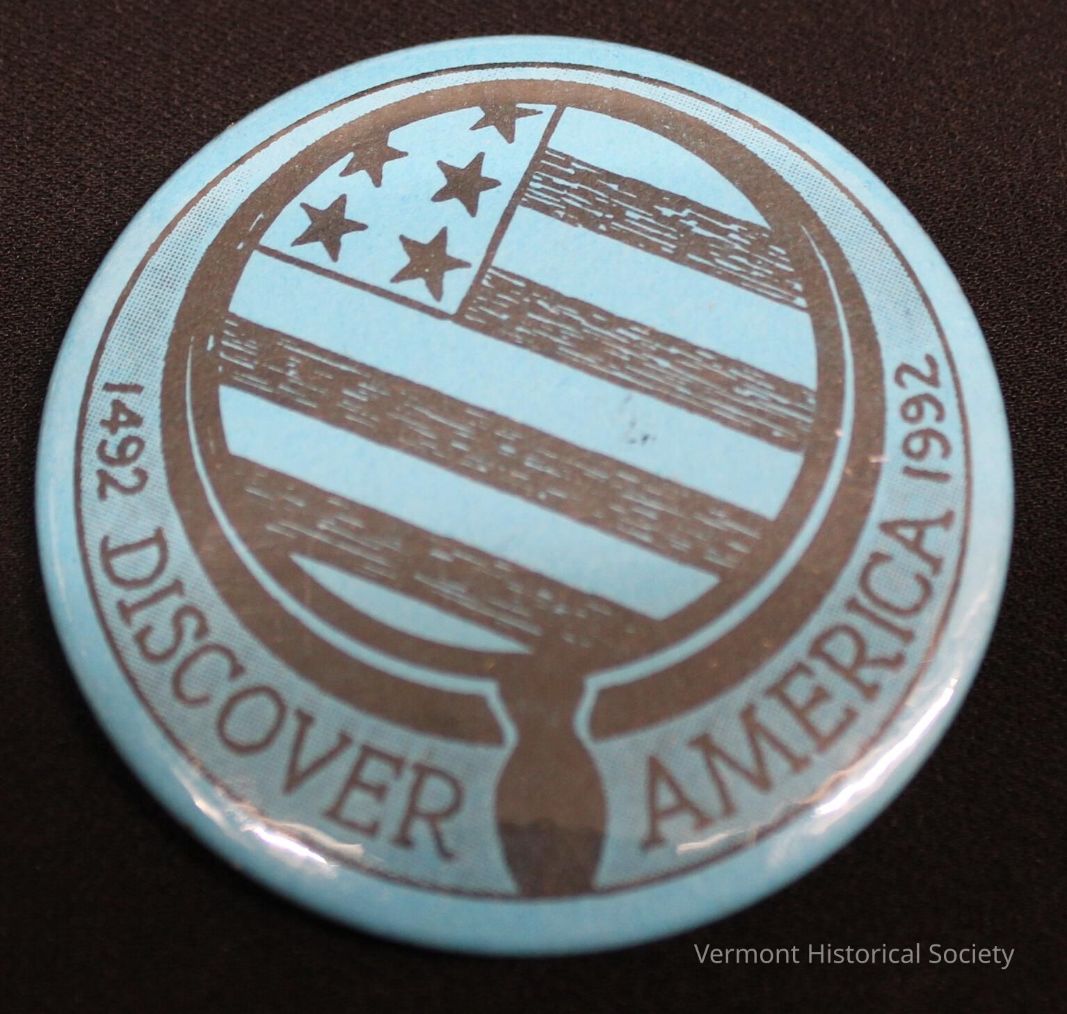 Round promotional buttons printed in brown with an illustration of a magnifying glass with a United States flag within the glass and the words, "1492 DISCOVER AMERICA 1992".Context