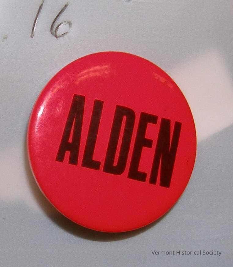 Bright orange / red pin with "ALDEN" in black block letters.