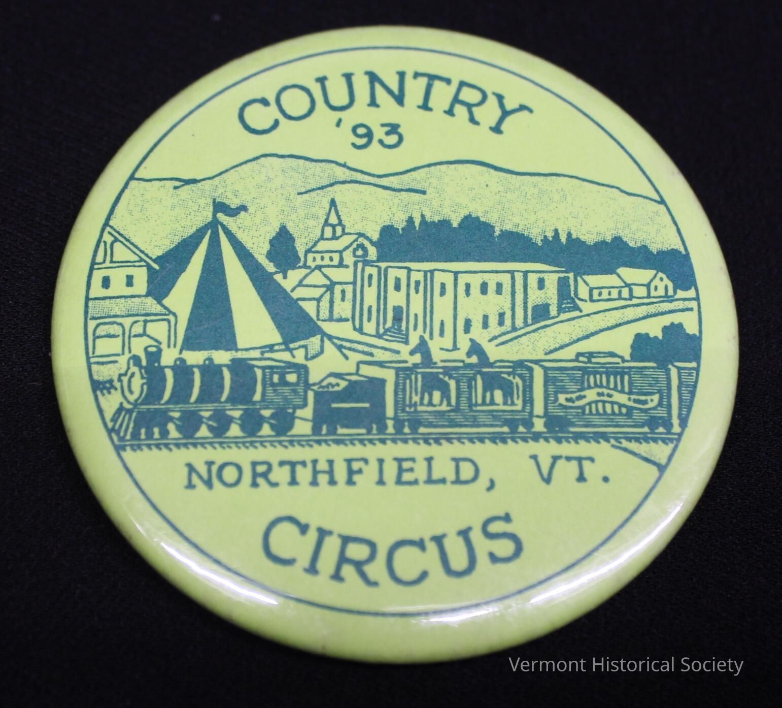 Round promotional button. Button is yellow with an illustration of a train in front of a town with mountains in the background in blue. The train has a car holding 2 giraffes, and there is a large, striped circus ten in the center of the town's main street. Written above the mountains is "COUNTRY / '93" and below the train is "NORTHFIELD, VT. / CIRCUS".Context