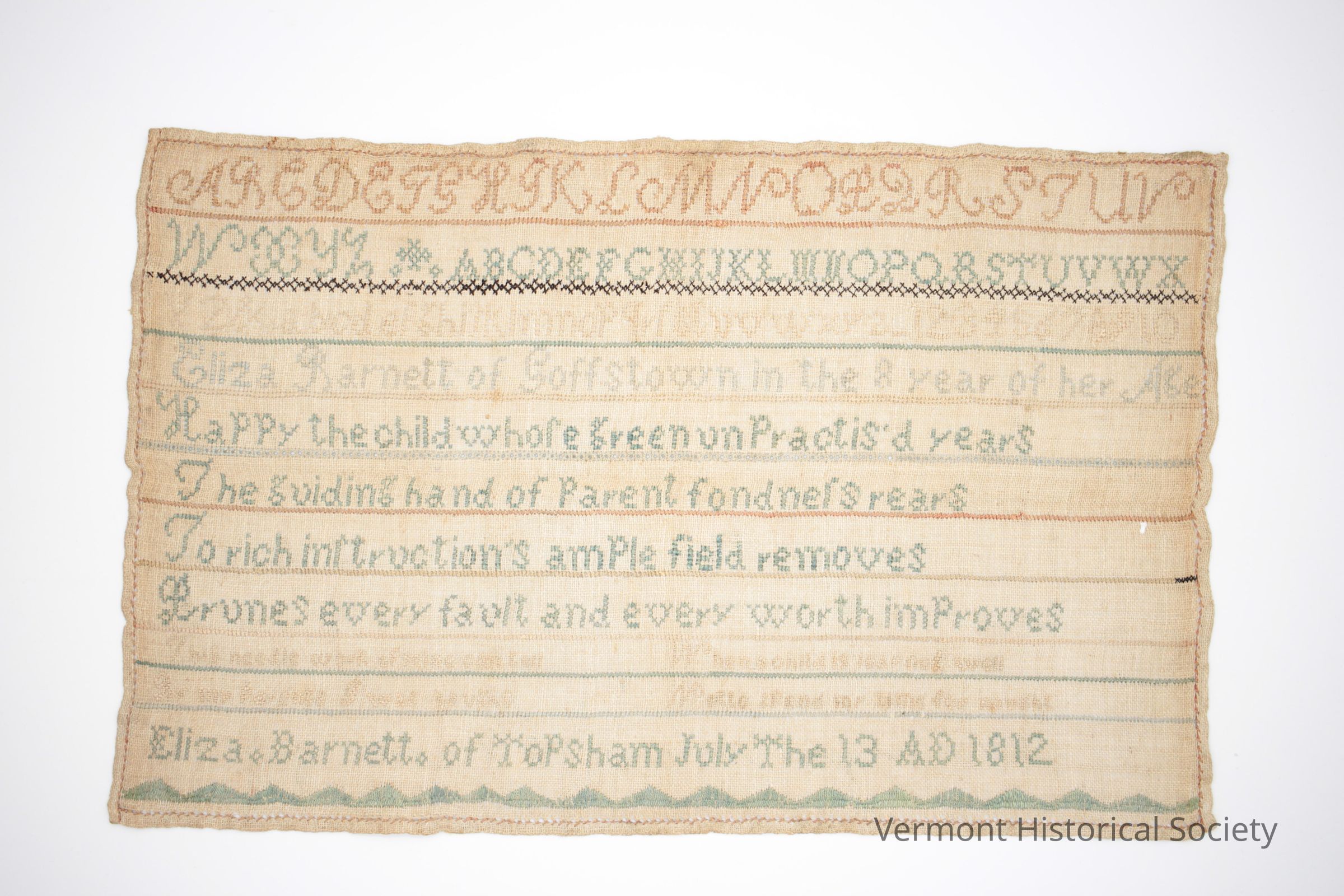 Rectangular sampler made with silk yarn on a plain-woven linen ground. from the top, the sampler consists of a script alphabet (capitals) in pink and blue, a marking alphabet (capitals) in blue, a marking alphabet (lowercase) in white, the numbers 1-10 in white, and the inscription, "Eliza Barnett of Goffstown in the 8 year of her Age/Happy the child whose green unpractis'd years/The guiding hand of parent fondnefs rears/To rich instructions ample field removes/Prunes every fault and every worth improves/This needle work of mine can tell/When a child is learned wee/By my parents I was taught/Not to spend my time for naught./Eliza Barnett of Topsham July The 13 AD 1812". Each line is separated by a simple border line.Context