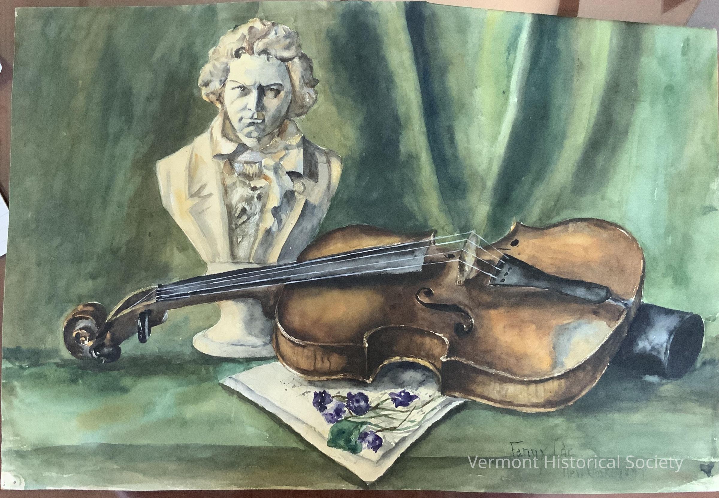A painting of a marble bust behind a violin with some sheets of paper and purple flowers, all against a green fabric background. It signed in the bottom right hand corner and dated “New York 1897.”Acquisition