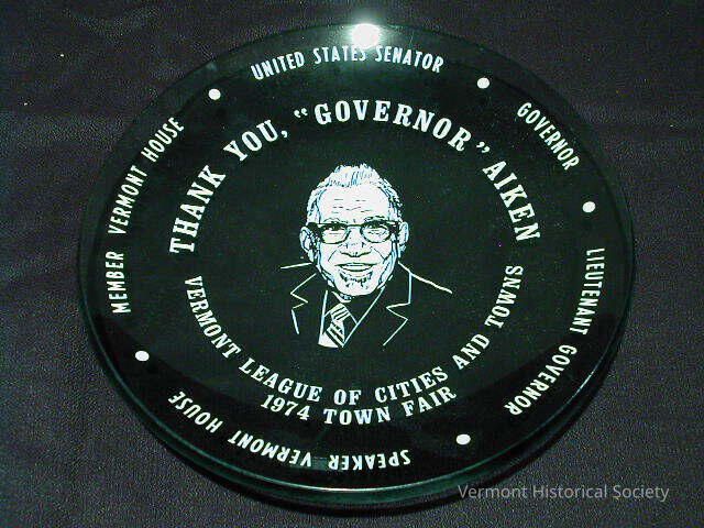 Grey glass plate printed in white with the inscription, "MEMBER VERMONT HOUSE . UNITED STATES SENATOR . GOVERNOR . LIEUTENANT GOVERNOR . SPEAKER VERMONT HOUSE" around the edge, and "THANK YOU, "GOVERNOR" AIKEN VERMONT LEAGUE OF CITIES AND TOWNS 1974 TOWN FAIR" in another ring inside the first. At the center is a white-printed portrait bust of George Aiken.