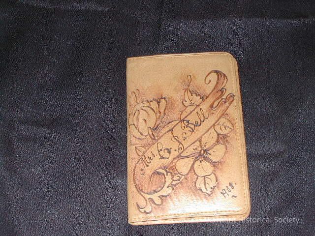 Leather card case decorated on the front with flowers and a banner that reads, "Mrs. C. J. Bell". The year 1905 is written in the lower right corner. A clear pocket shows a blue paper pass for the Boston & Maine Railroad, giving Hon. C. J. Bell and family complimentary use of the railroad within Vermont for the year of 1906. There is also a calling card that reads, "Mrs. Charles James Bell".