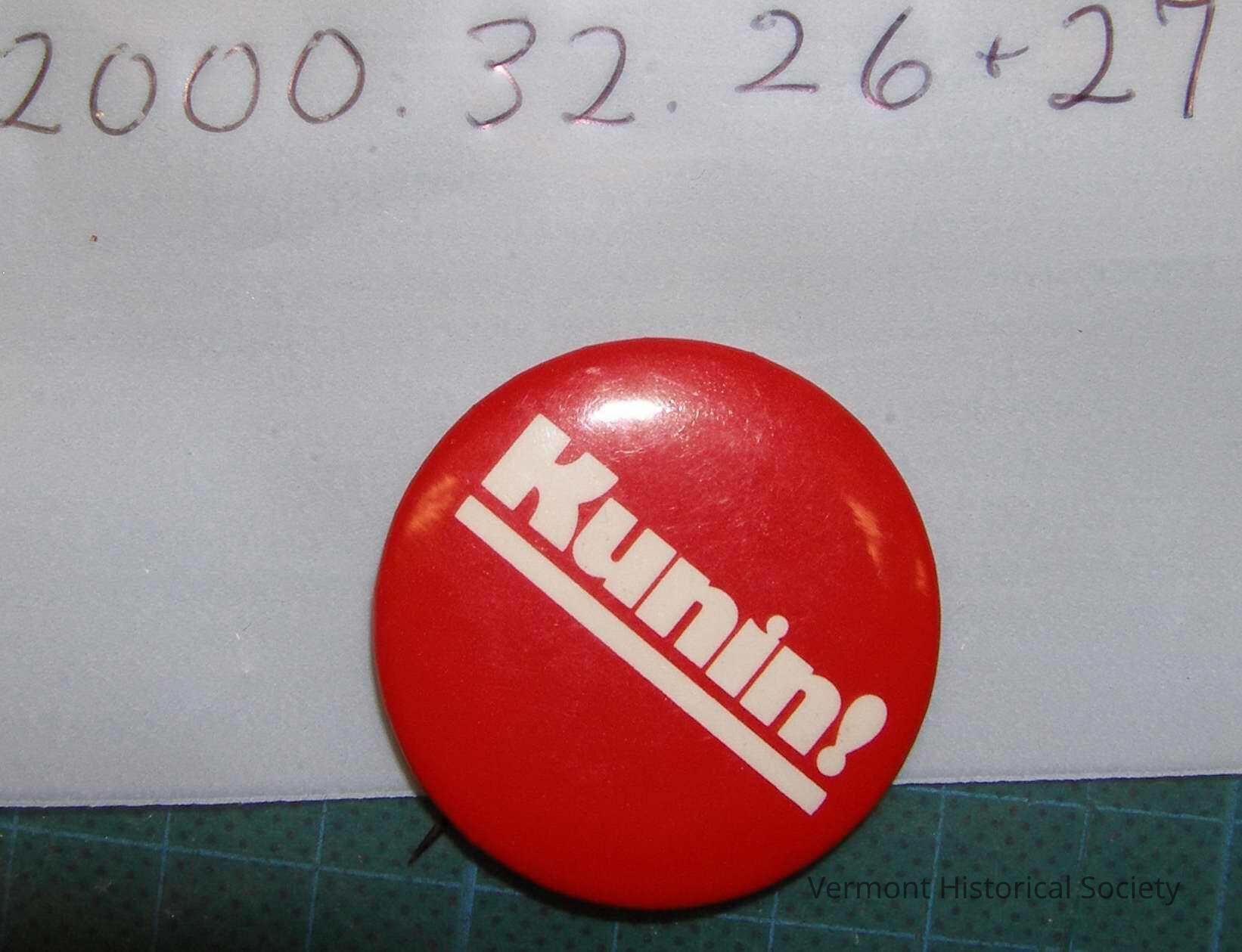 Round red pin. In the center is the word "Kunin!" written in white with a bold white underline.Context