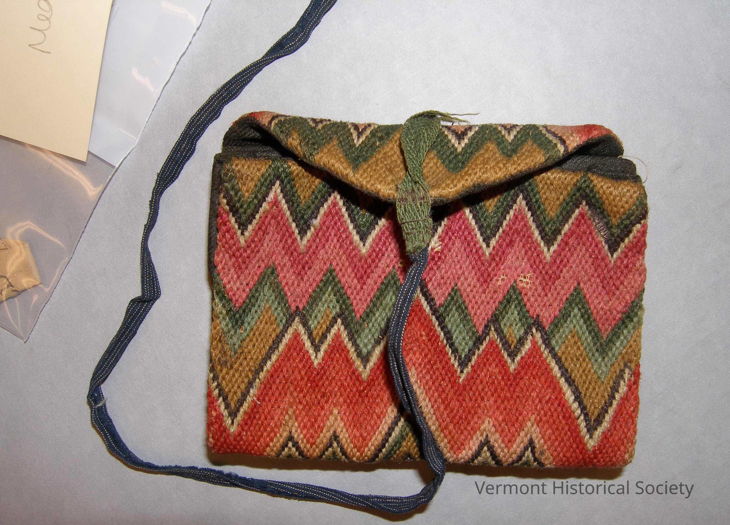 Envelope-style pocketbook, decorated with flame stitch in red (3 shades), pink (3 shades), green (3 shades), black, and white. The pocketbook secures closed with a long pieces of blue wool tape that wraps around it, connecting to the center of the top flap with a short piece of green wool tape. The sides are enclosed with green wool, and the interior is divided into two compartments. A small piece of paper folded to enclose powder or tablets was found inside. The contents of the paper is no longer present.
