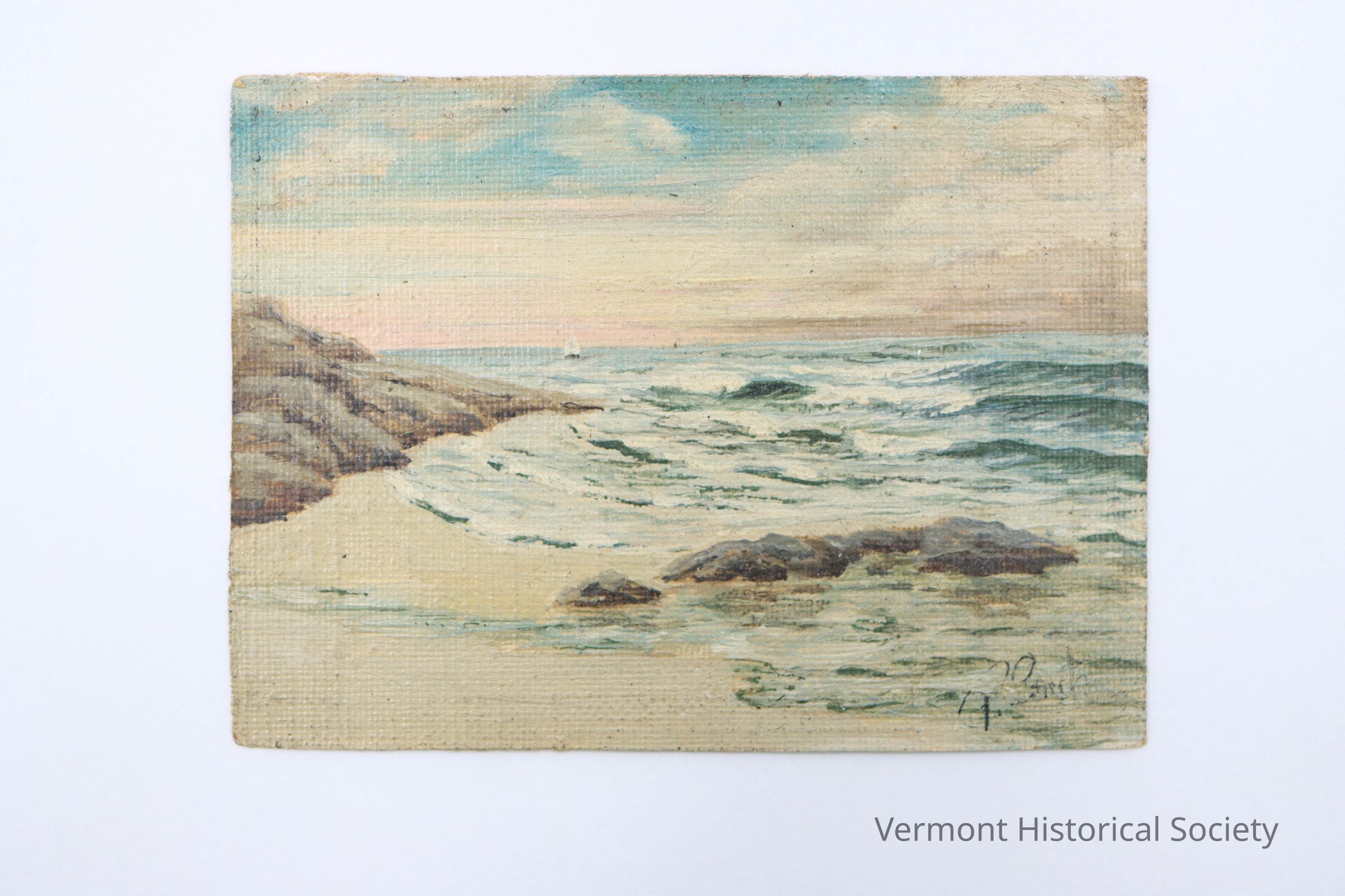 Small oil painting on canvas depicting a shoreline and choppy waves. The shore is on the left and bottom of the composition, and consists of a span of sand with some small, grey rocks at center and a large rock on the left edge. There is a small sailboat visible near the horizon at the center-left of the composition. The sky has white clouds and fades from blue to pink. It is signed illegibly in the bottom right corner.Type of Painting