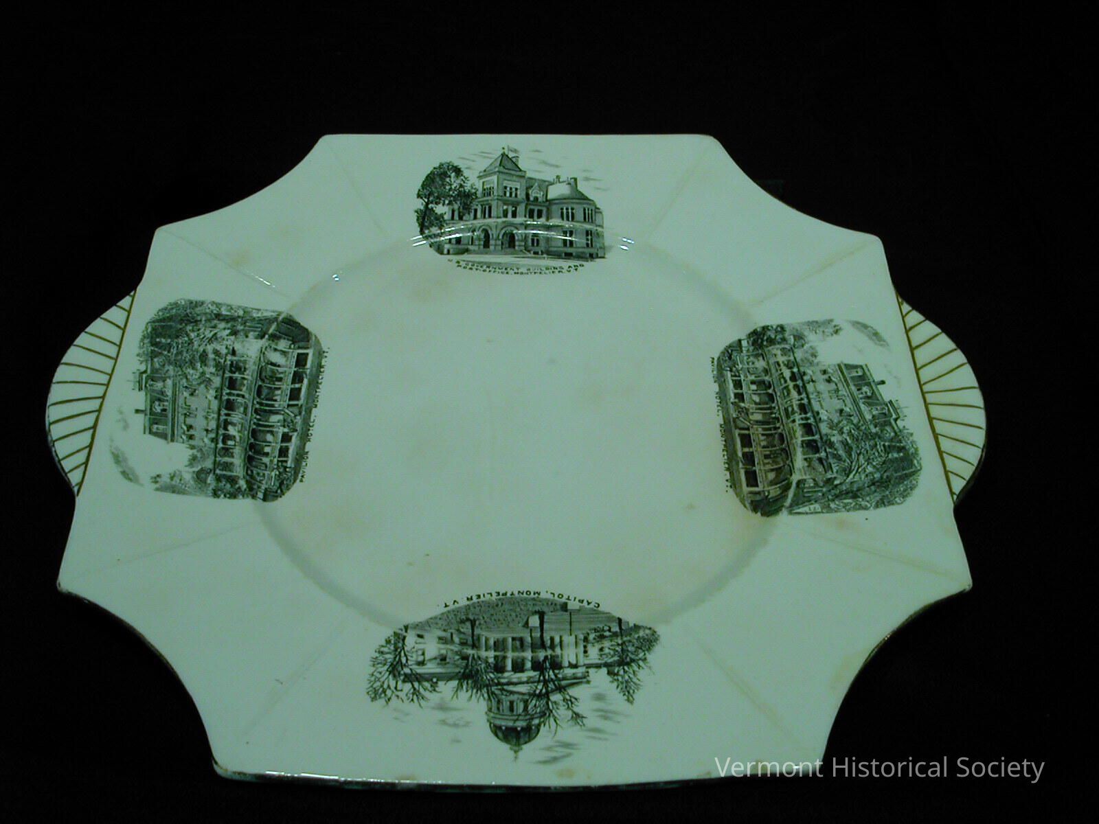 Decorative souvenir plate printed with images of buildings. The plate is square with concave corners, and a semicircles added to two sides. The printed images are on the rim and show the Pavilion (twice), the Vermont State House, and the Post Office of Montpelier.Context