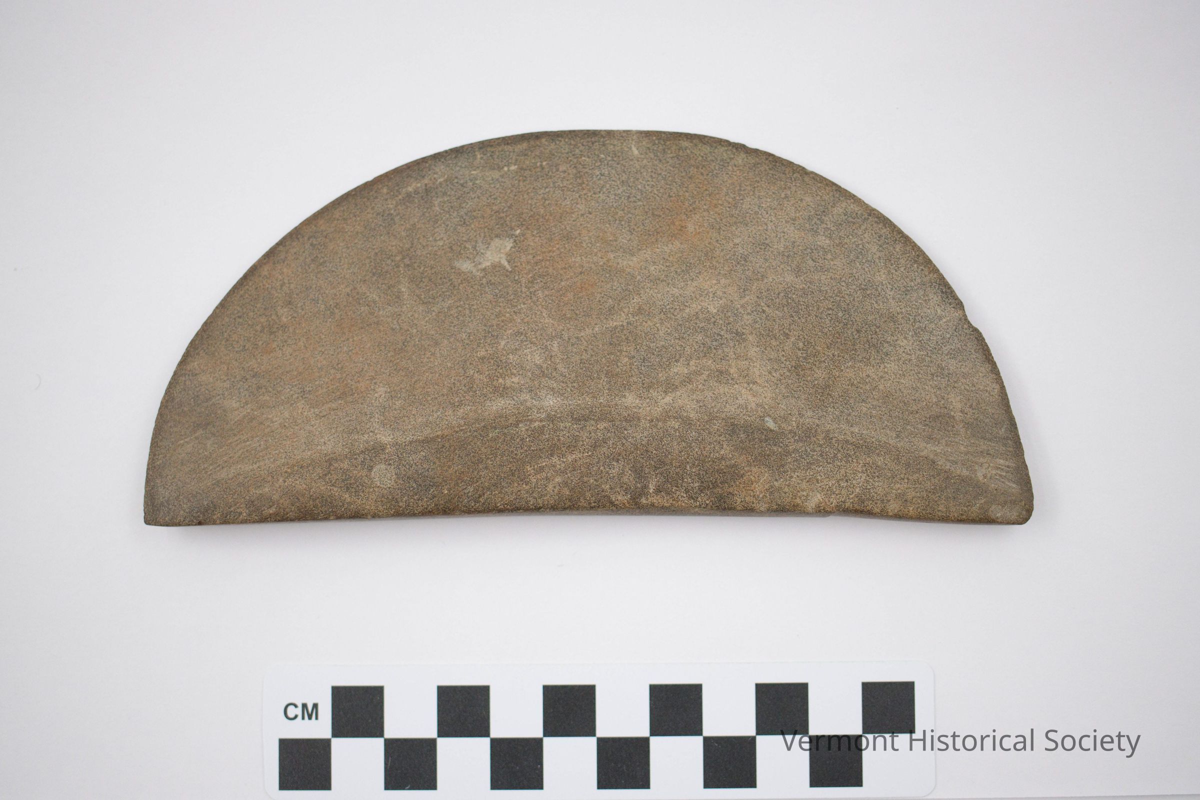 Semi-circular ground stone knife. Both the blade and handle ends are polished, and the edge is sharp.