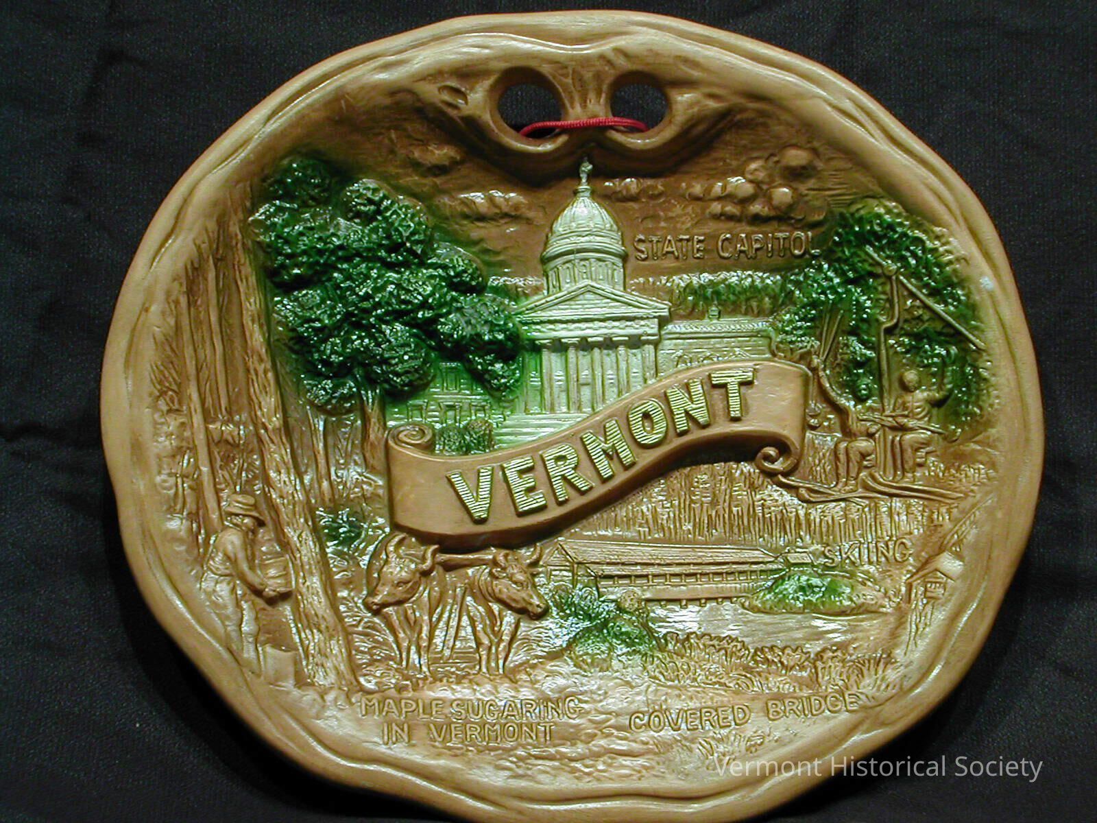 Decorative ceramic plate or plaque molded with a three-dimensional scene. The center of the plate has the word "VERMONT" within a ribbon. Above the ribbon is the state house with the label "STATE CAPITOL", to the right is a couple on a ski lift labeled "SKIING", below is a covered bridge labeled "COVERED BRIDGE", and two cows next to a farmer carrying a bucket labeled "MAPLE SUGARING IN VERMONT". There are two holes in the center top for hanging. The back is hollow.