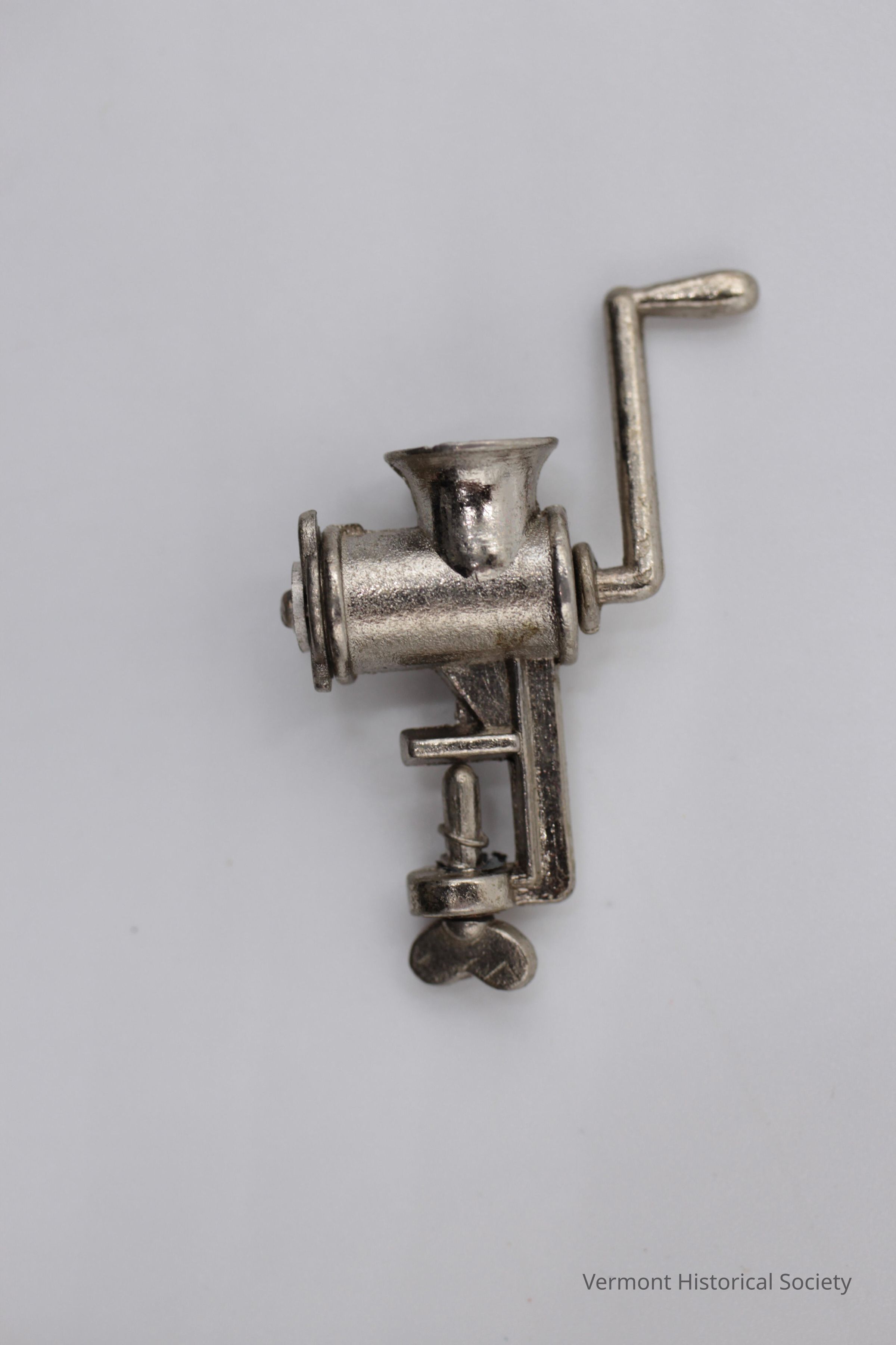 Miniature metal meat grinder. The grinder consists of a clamp, a horizontal cylinder, a flared vertical cylinder, and a long handle. The handle rotates, and the lower bolt of the clamp is functional.Context