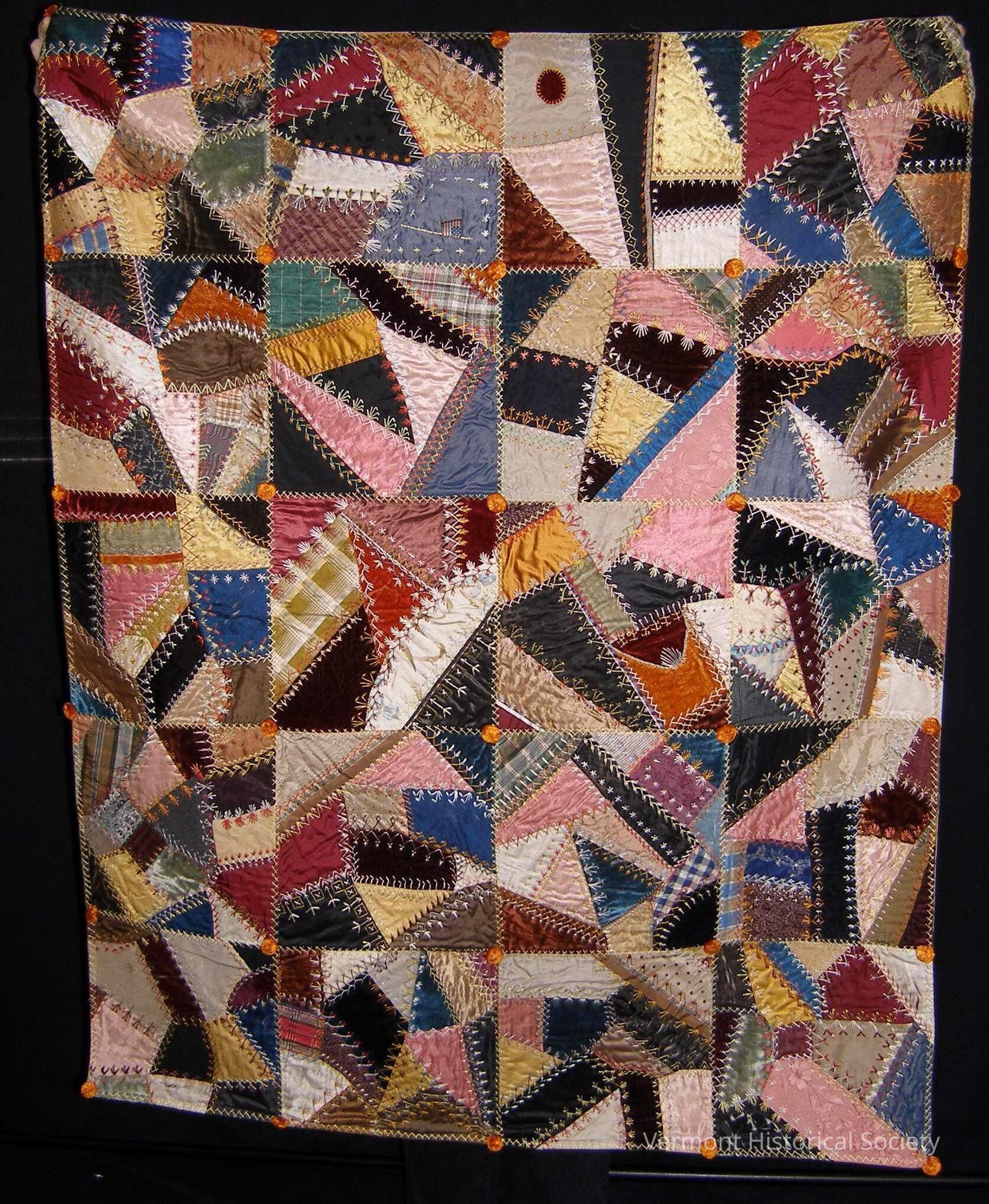 Crazy quilt pieced of silk fabrics in satin, plain, and velvet weaves. The corner of each block is decorated with an orange pompom, and every seam is elaborately embroidered with stitches ranging from blanket stitch to herringbone stitch. A United States flag ribbon has been appliqued on the top row, and a velvet pouch has been appliqued near the center.Context