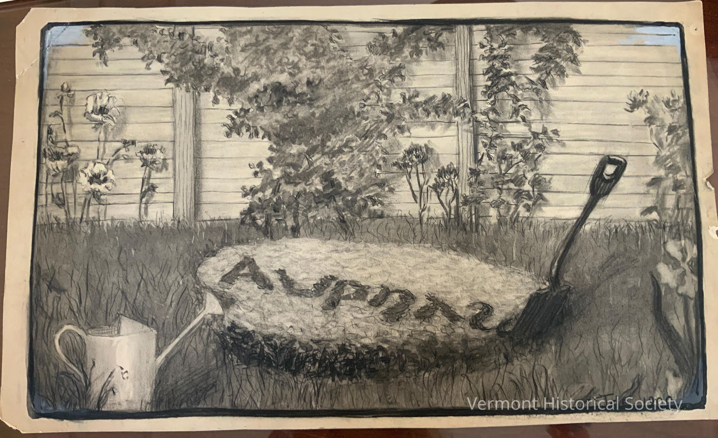 A drawing of of a shovel and a watering can near some recently dug dirt that reads “Αυρηλια” or “Aurelia” in Greek. The scene is set against a wooden wall of some sort. It is charcoal and graphite. Signed in the bottom right corner and dated 1900.