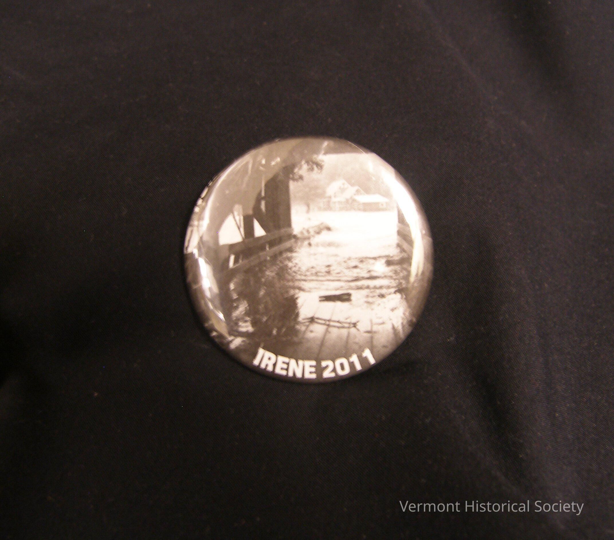 Round button printed with a black-and-white photograph showing a flooded area taken from the inside of a covered bridge. The inscription "IRENE 2011" rings the edge.Context