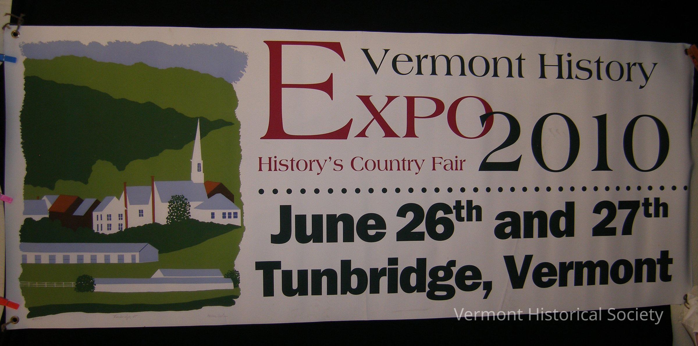 White vinyl banner. The left side of the banner is printed with an illustration of a village set amid green hills. The buildings in the village, which include houses, a church, and what appears to be a storage unit, all have white walls and blue-grey roofs. The rest of the banner is printed with the inscription, "Vermont History Expo 2010 / History's Country Fair / June 26th and 27th Tunbridge, Vermont".Context