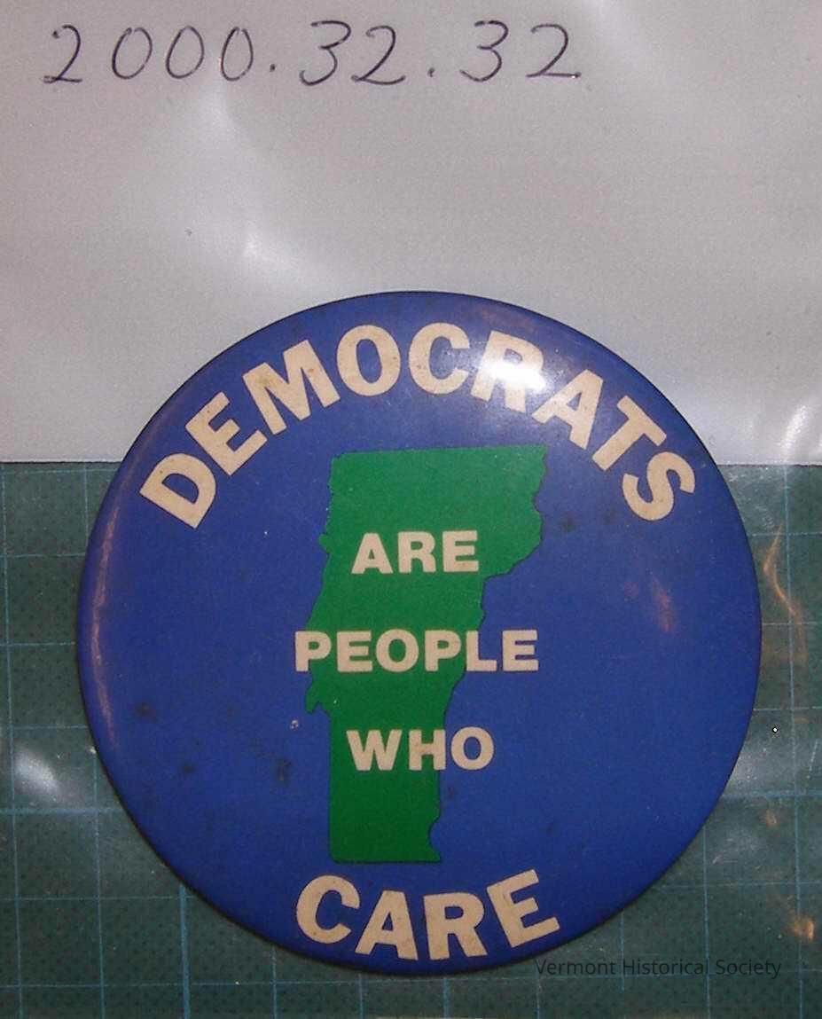 Round blue button. Along the top edge "DEMOCRATS" is written in white and along the bottom edge "CARE" is written in white. In the center of the button is the image of the state of Vermont in green with the words "ARE / PEOPLE / WHO" in white written on top of the image.