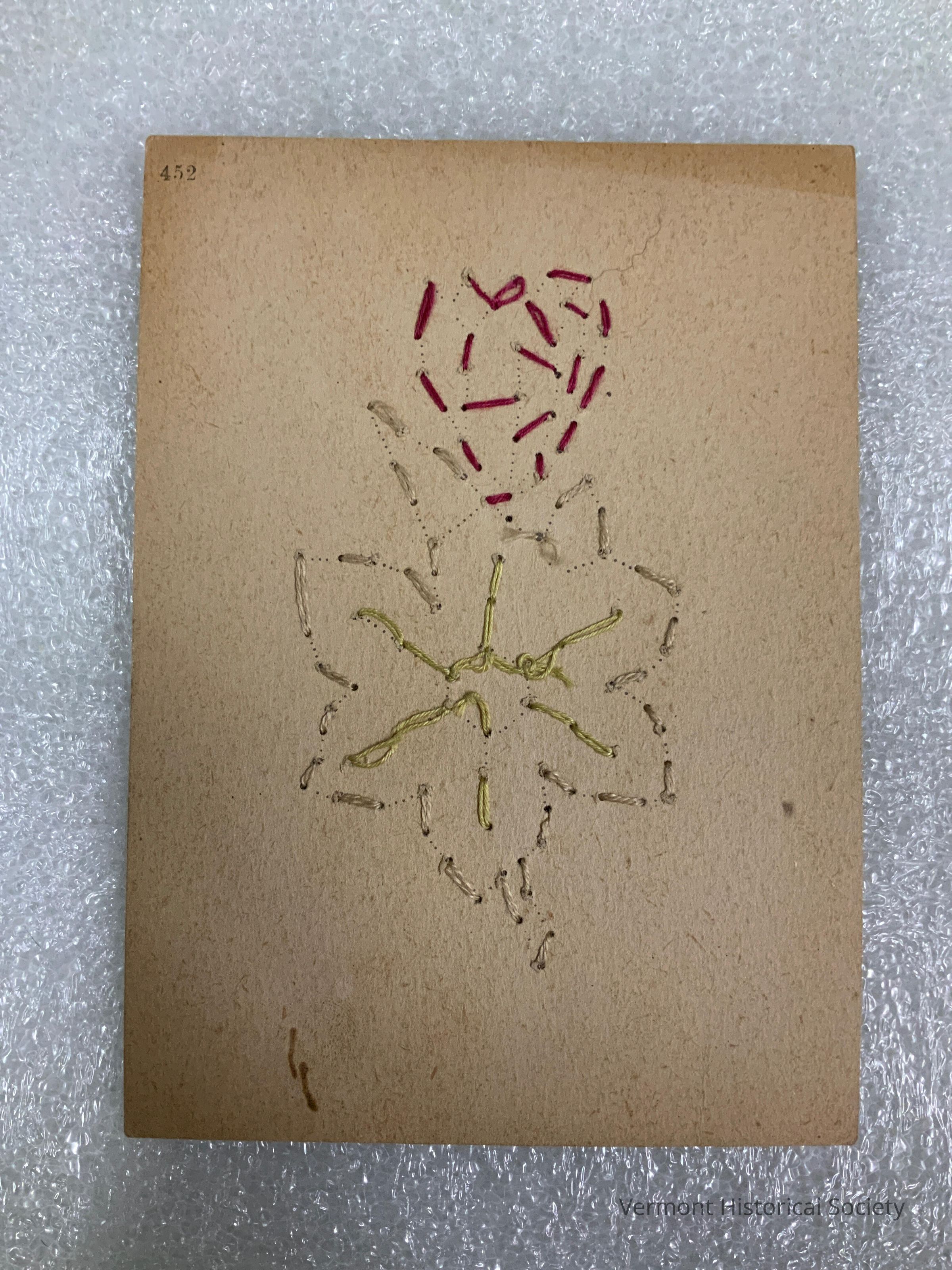 Rectangular cardboard sewing card printed on one side with a dotted line drawing of a 6-petaled flower and a tulip. There are holes punched through each dotted line. The holes have been stitched with embroidery thread. The cream and yellow stitching mostly follows the outline of the petaled flower, but the red stitching deviates from the outline of the tulip enough for it to more closely resemble a heart.Context