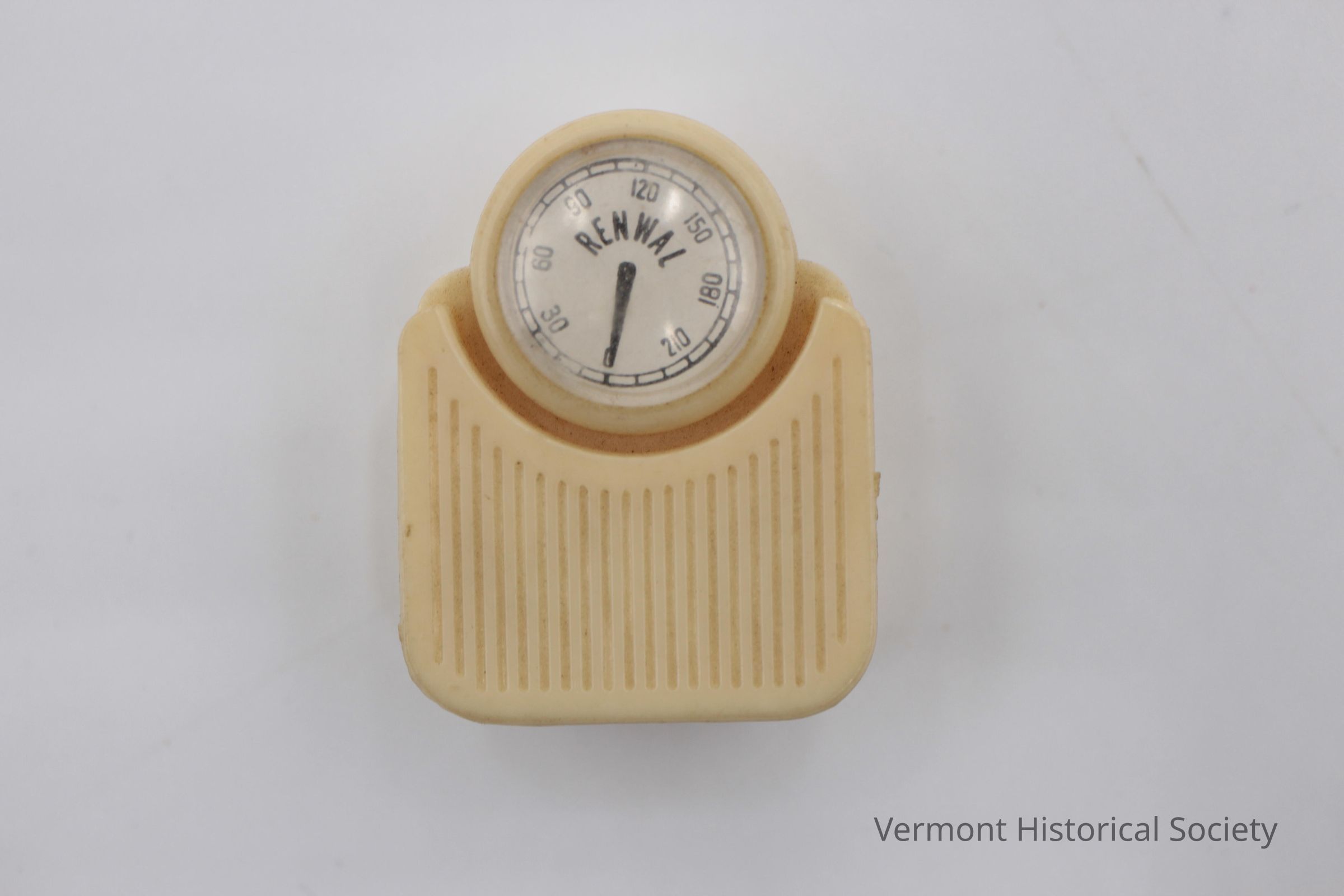 Miniature plastic floor scale. The scale consists of a square, fluted base with a round dial face at the top. There is a white sticker for the dial printed with Arabic numerals and the word, "RENWAL". The back of the scale is molded with the words, "Renwal / U.S.A. / NO. 10".Context