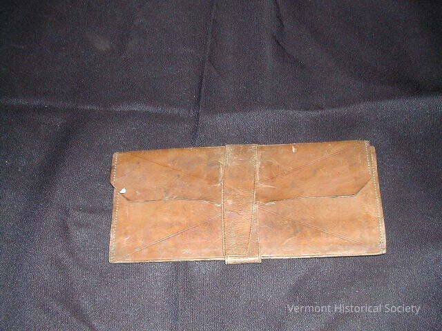 Leather trifold wallet. The wallet secures closed with a long leather strap that wraps around it. The interior is decoratively embossed, and there are several columns of numbers written in ink on the inside flap.