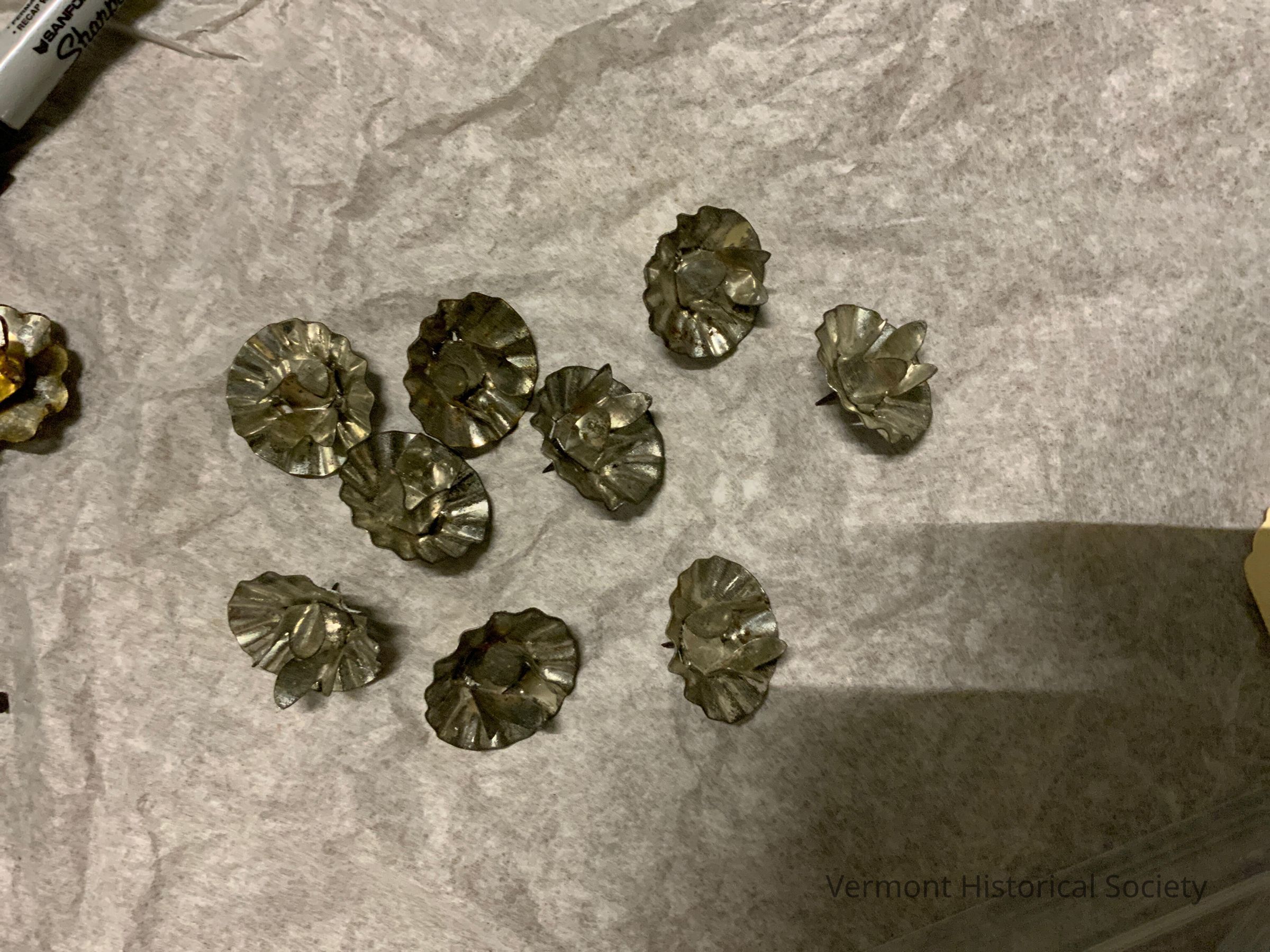 Eight tin candleholder. Each holder has a round base with a flared, fluted edge, and a nail in the center bottom. At the center top, each has a narrow holder made of four petals facing upward.Use