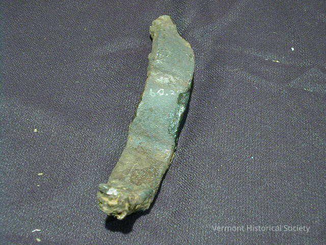 Bent rectangular metal fragment, possibly from strapping. One end is bent toward the flat size, and the other end is bent and slightly twisted in the opposite direction.