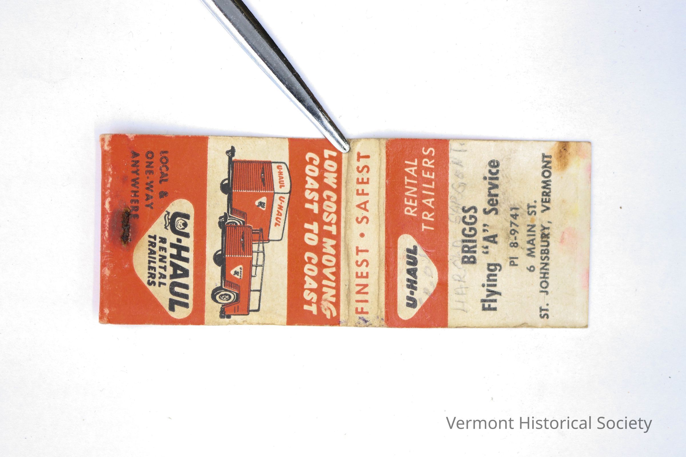 White and orange cardboard bifold matchbook. The front flap is printed with the inscription, "U-HAUL RENTAL TRAILERS / BRIGGS Flying "A" Service Pl 8-9741 6 MAIN ST. ST. JOHNSBURY, VERMONT".