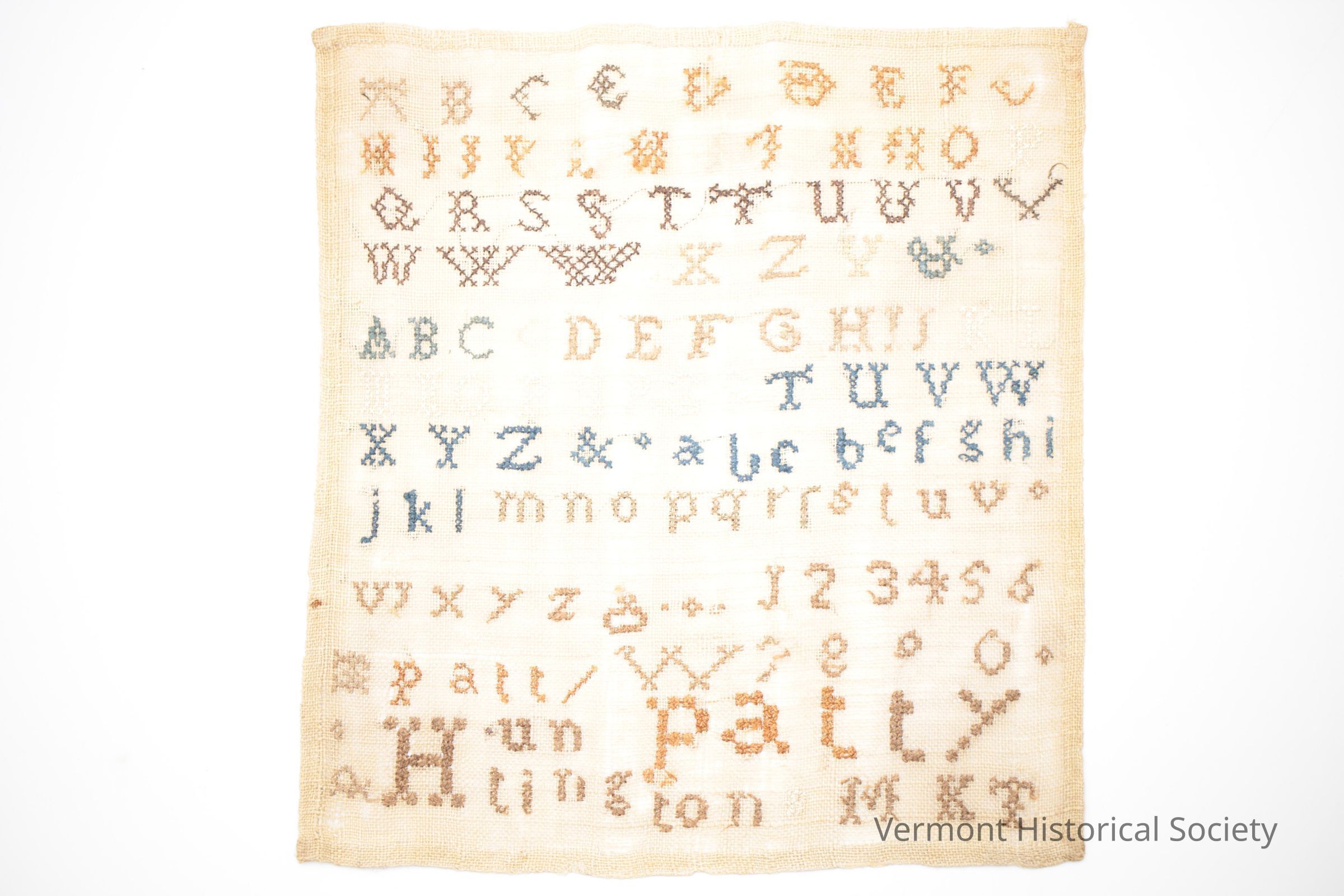 Small alphabet sampler on plain-woven linen. The alphabets are stitched in a marching style in grey, light brown, dark brown, and blue thread. The first alphabet consists entirely of decorative capital alternates; the second alphabet is standard capitals; the third alphabet is lower case letters. The alphabets are followed by an ampersand, three periods, the numerals 1-9 and 0, and the inscription, "I patty W / Huntington / patty / MKT".Context