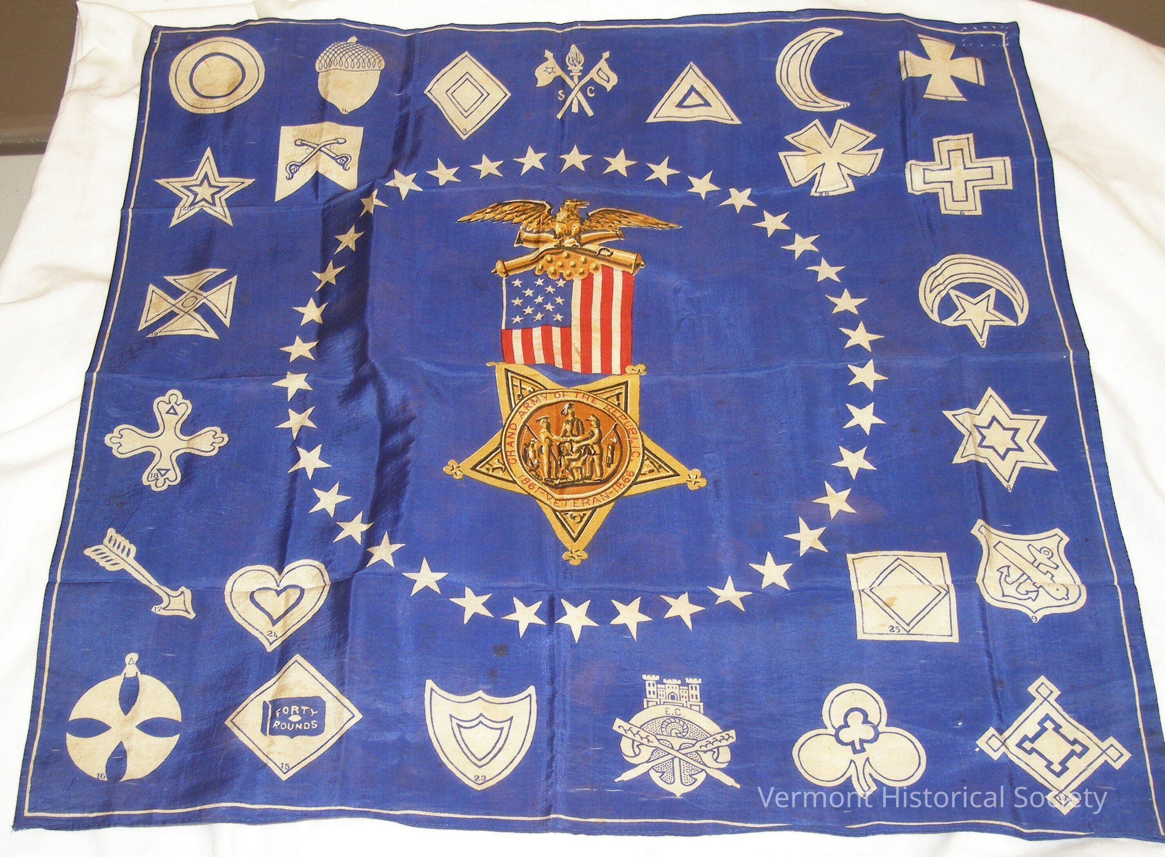 Square silk scarf. The printed scarf has a blue background and an image of a Grand Army of the Republic (GAR) membership ribbon at the center, printed in full color. The ribbon is surrounded by a circle of 40 stars. Outside the circle, printed in white, are several military symbols including various types of cross, stars, and banners.Acquisition