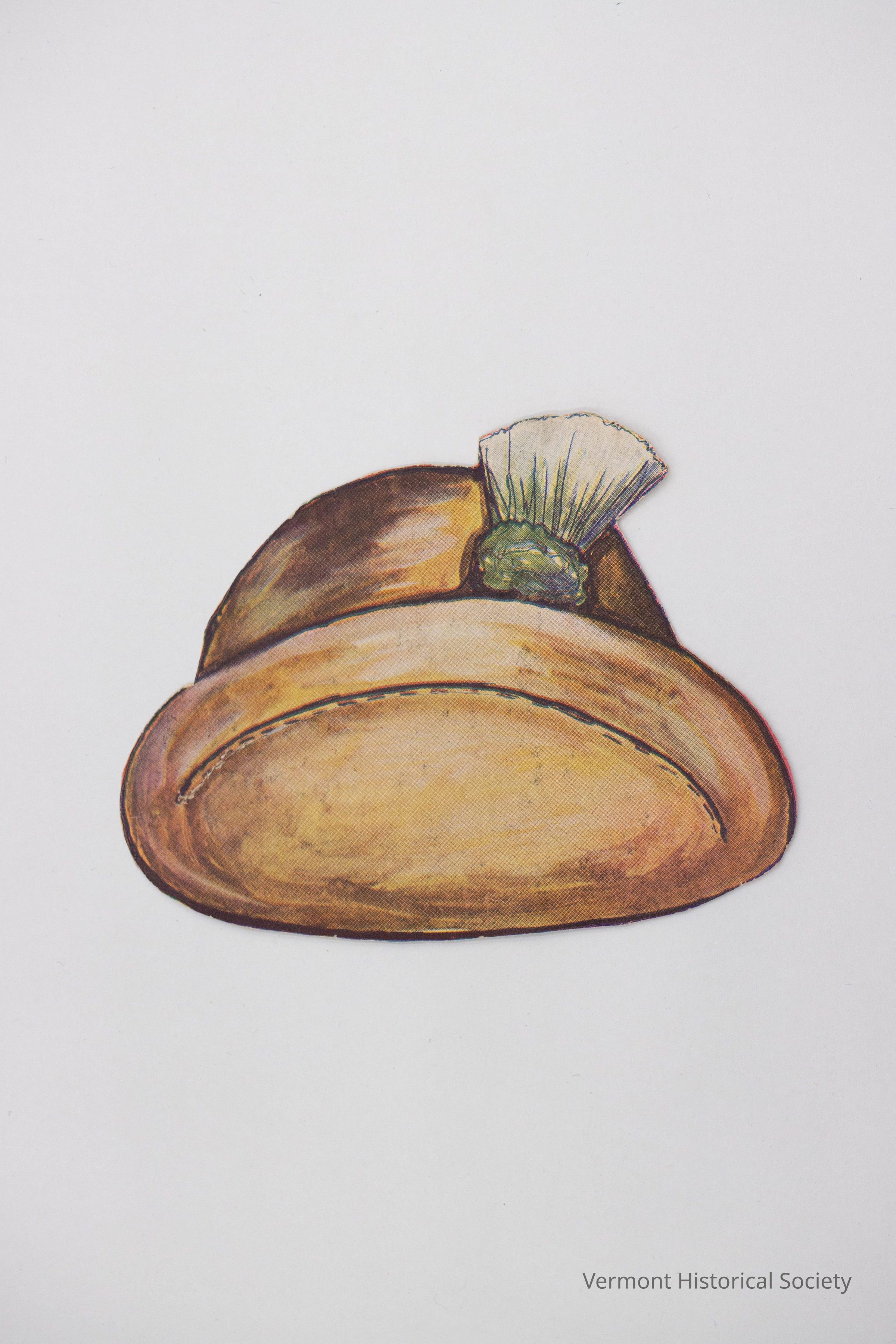 Brown, printed paper hat for a paper doll. It has a curled brim and a green ornament. The back shows a portion of a sales catalog page.Context