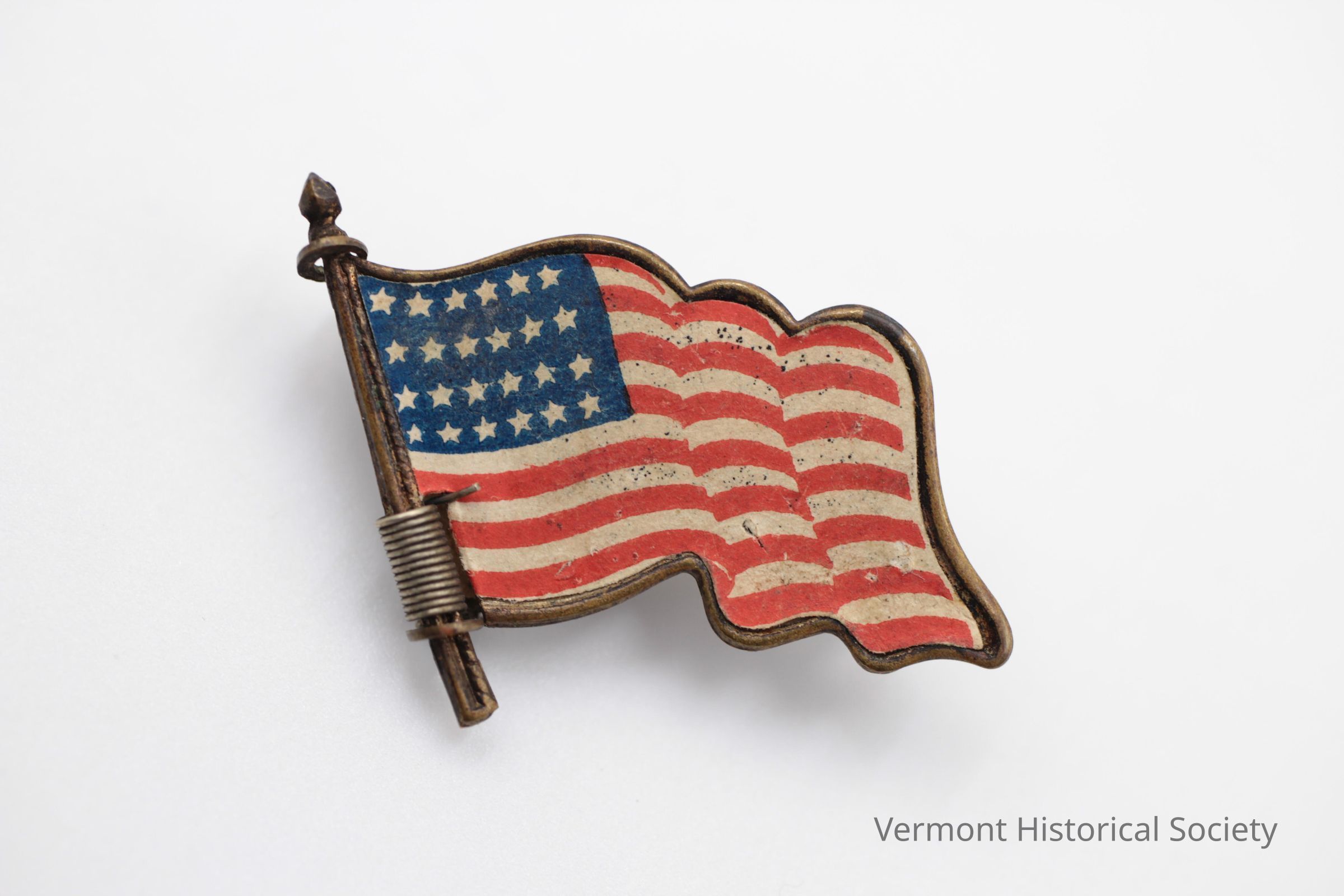 Metal pin in the shape of a waving flag. The pin has a paper sticker on the front that is printed to look like the United States flag. A hinge on the flagpole allows the flag to fold open to reveal the inscription, "To Hell with Spain, Remember the Maine".Context