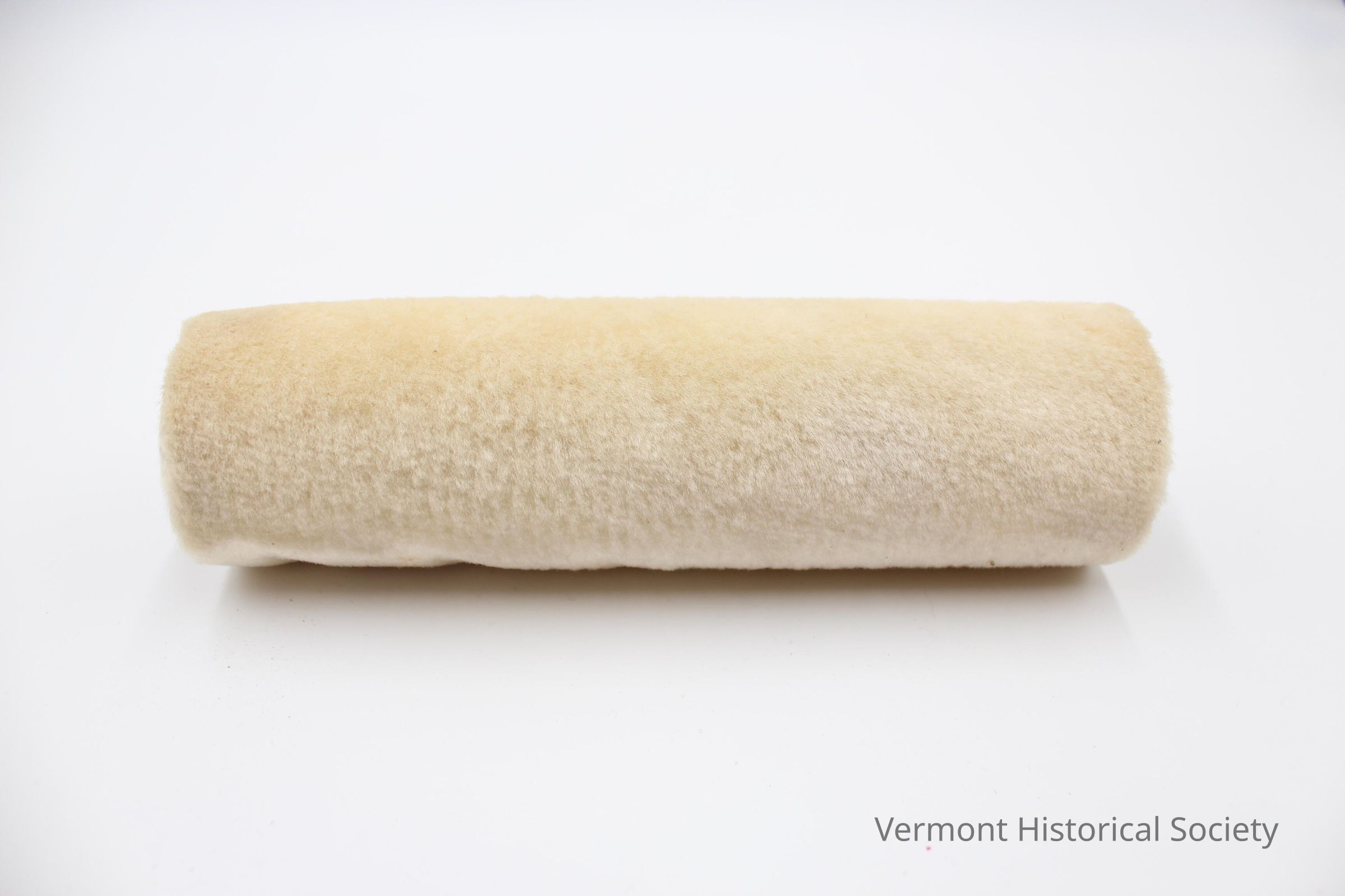 Paint roller brush consisting of a tube of cardboard with fuzzy, yellow/salmon-colored fibers applied around the outside.Context