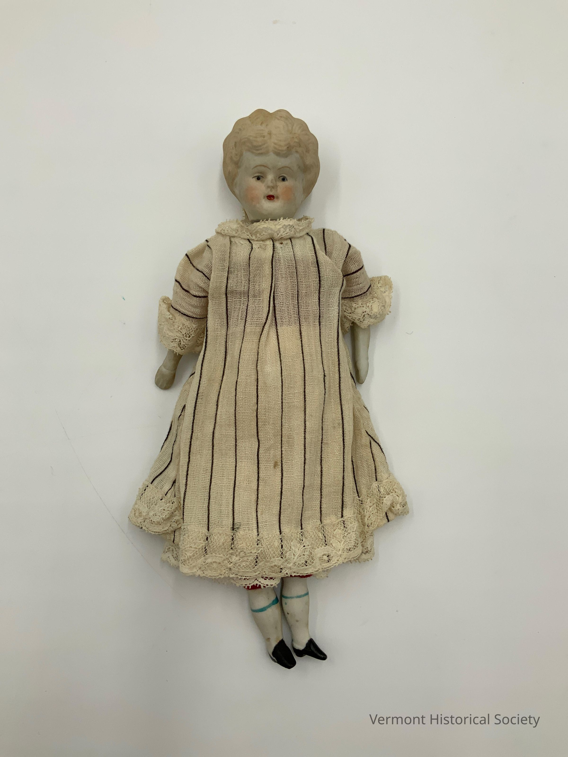 Doll with bisque porcelain head, bust, arms, and leg, and a soft body. The head is made separately from the torso and is connected by a wire inserted into the neck and through a hole in the center of the bust, allowing the head to wobble. The skin is unpainted (white), and the hair and face and molded and painted. The hair is short, waved, and blonde. The doll has blue eyes, pink cheeks, and red mouth. The legs are painted with blue stripe to indicate socks, and the feet are painted with black shoes. The soft body is stuffed with sawdust. The doll is wearing a dress made of white cotton with black horizontal stripes. The collar, cuffs, and hem are trimmed in white lace. The soft body is red, and the doll is wearing a white petticoat under the dress.Acquisition