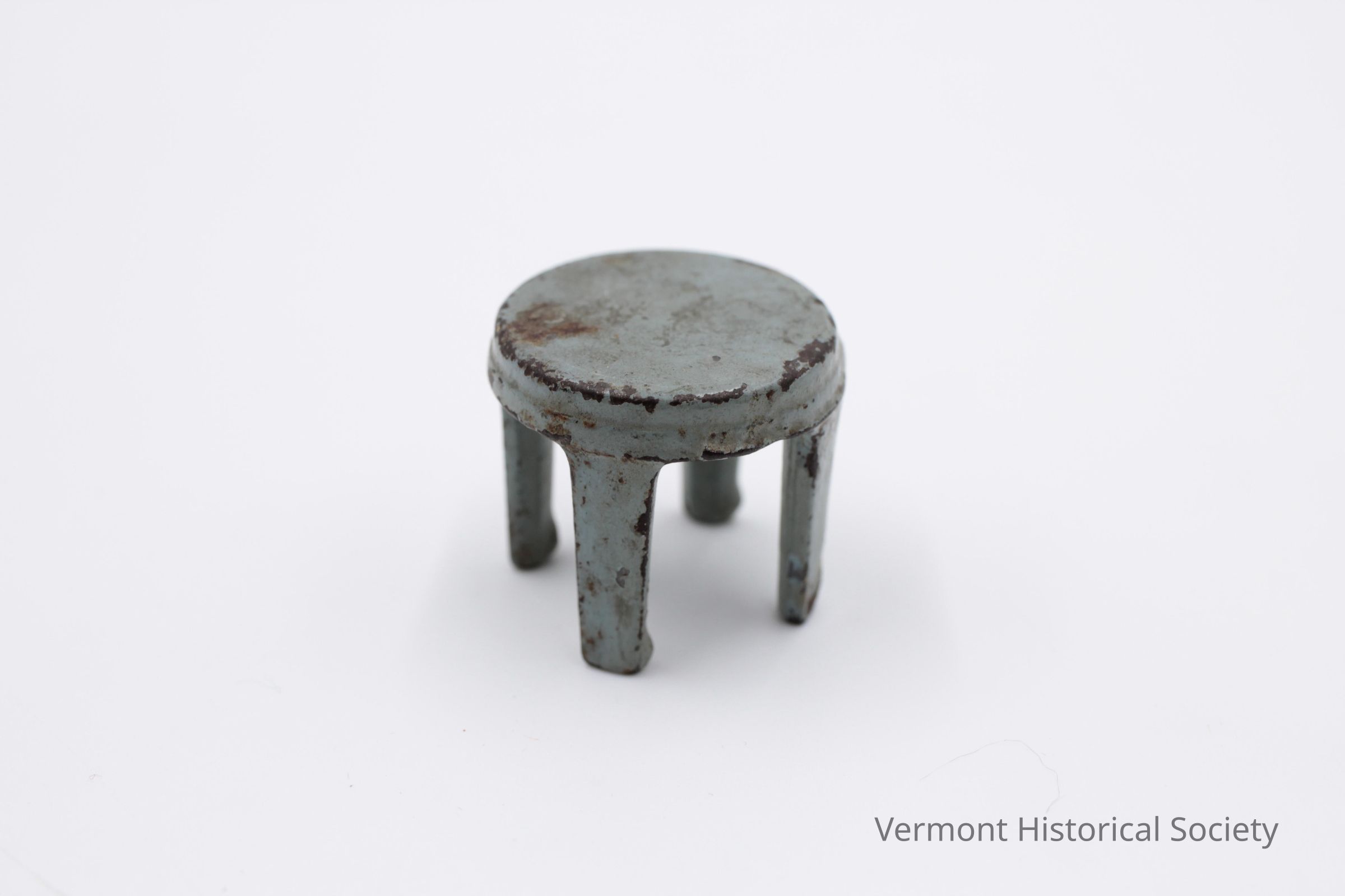 Miniature round side table sized for a dollhouse. The table is made of cast iron and painted grey. It has four legs.Context
