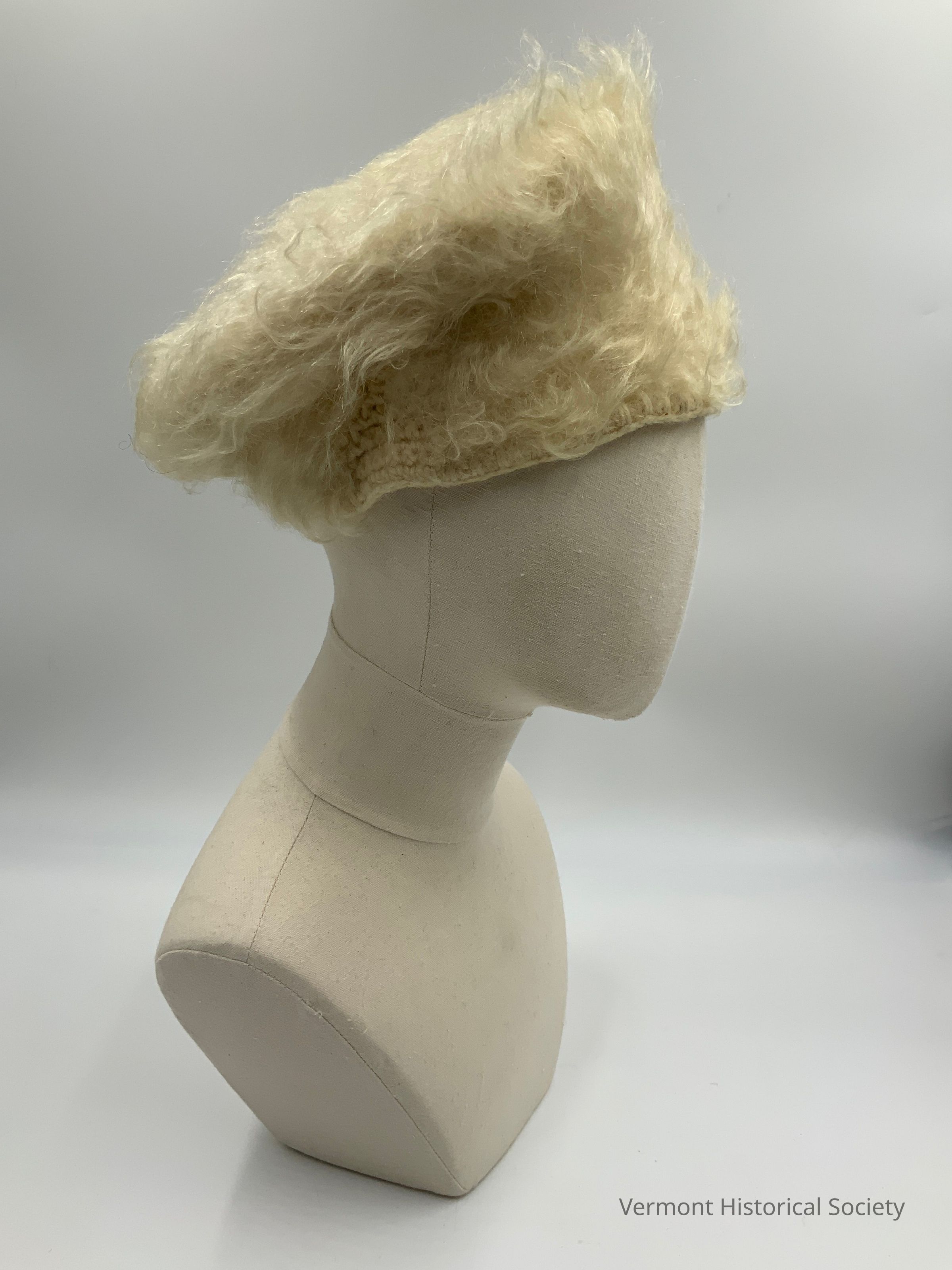 White wool beret. The body of the beret is knitted with crocheted gores along the brim. The knitted portion has a high pile, resembling fur.