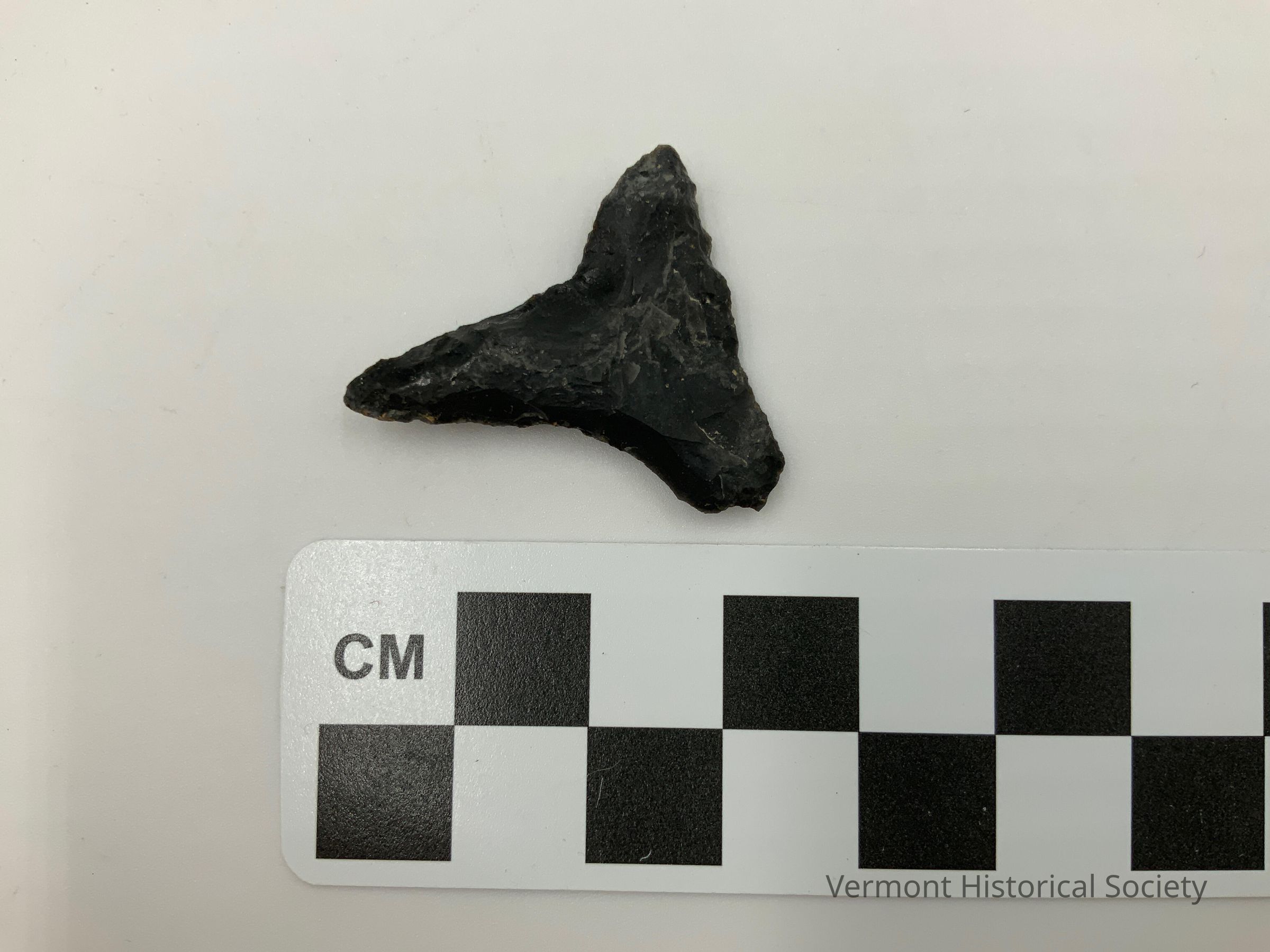 Chipped stone drill made of black chert. The base is wide, and the drill is symmetrical with straight blade edges.Context