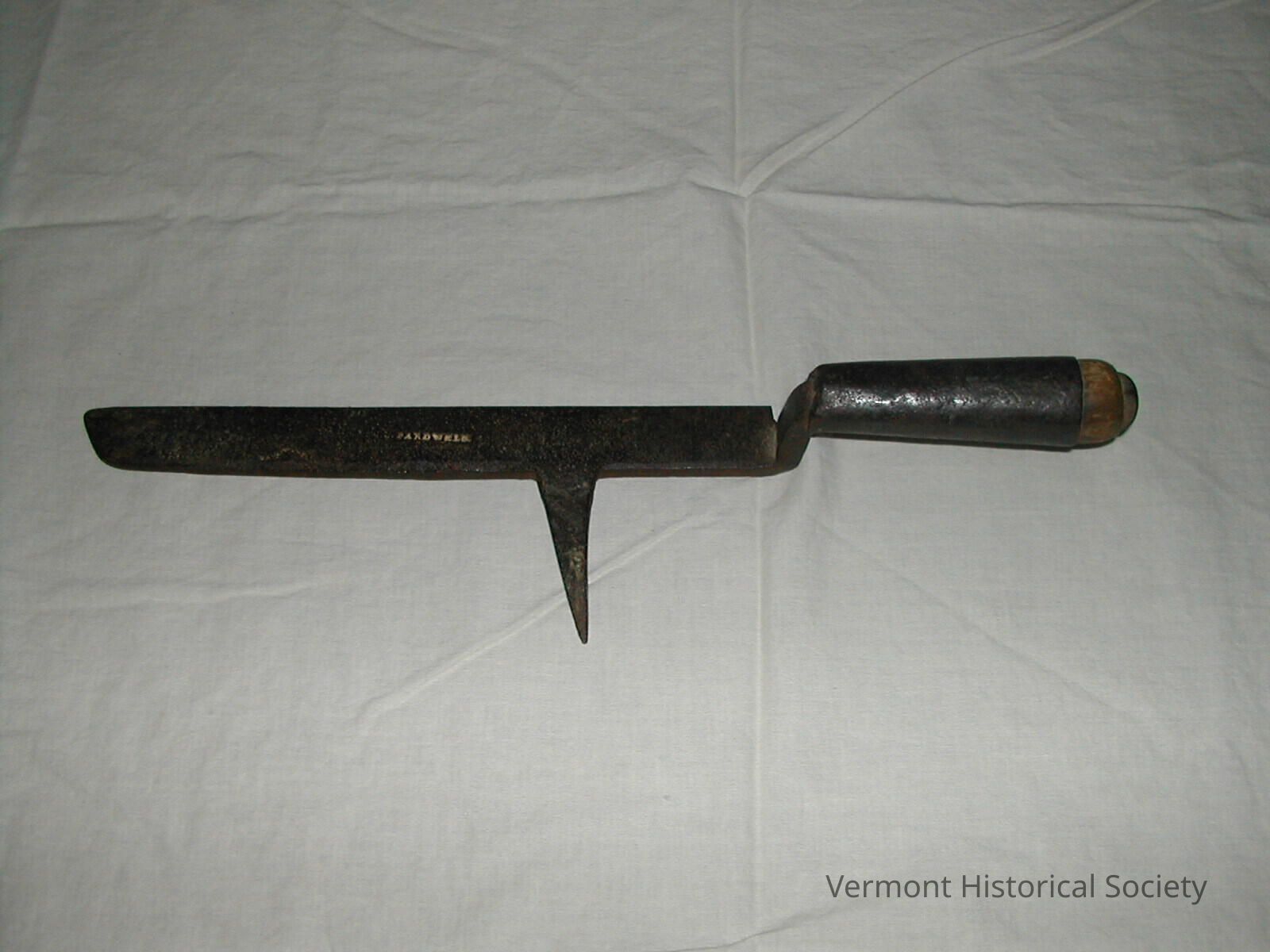 Used for cutting roofing slate. The point would be driven into a block of wood, and slate would be laid across the blade for cutting.