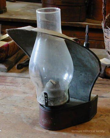 Camp lantern with hurricane glass and tin cover/reflector. The glass sits on a round base, held in place with four metal prongs. The glass extends upward through a hole in a bent tin cover that stretches from the red-painted base over the light.