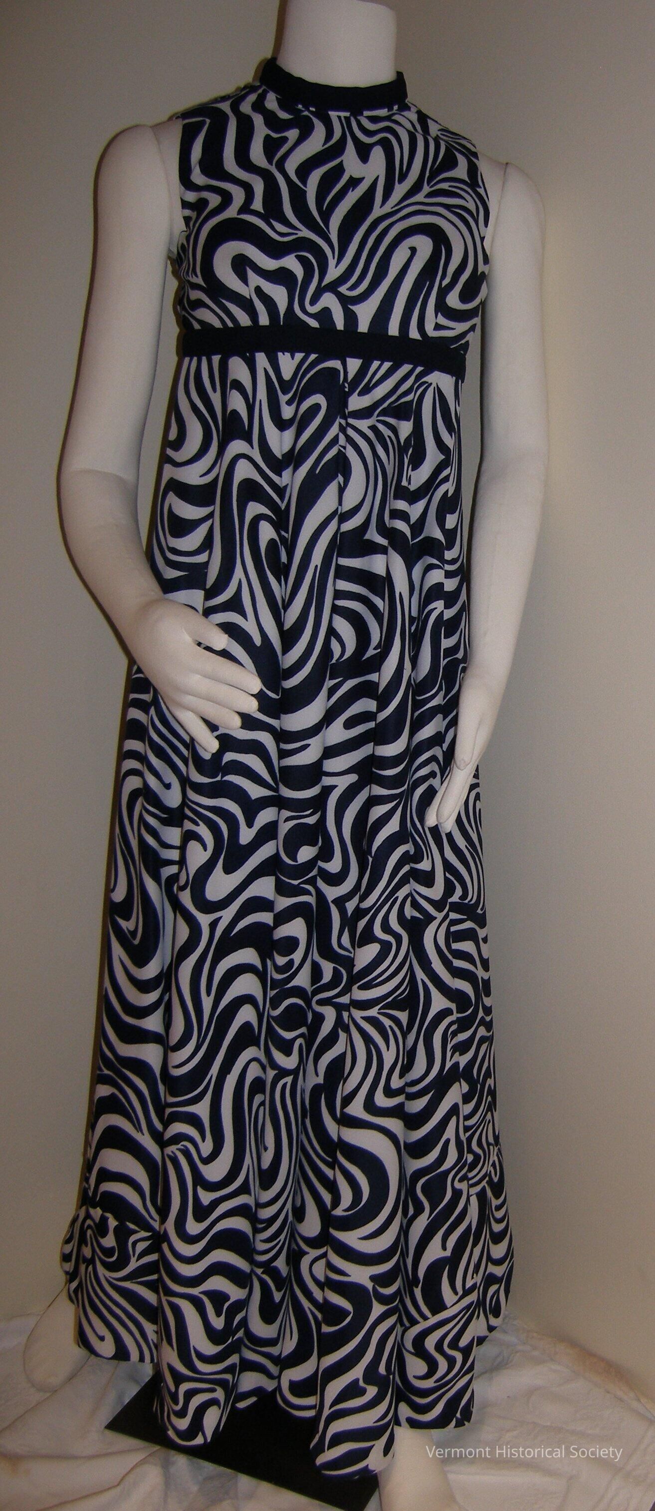 Sleeveless full-body suit. The jumpsuit looks like a dress, but the legs are split into wide pants. The fabric is printed with a swirled navy blue-and-white pattern. There is a navy blue band at the empire waistline and a navy blue neckband. The waistband has a bow at the center back. The jumpsuit closes with a zipper up the center back. A tag inside the garment reads, "Custom Made Especially for you by Win Frantz".