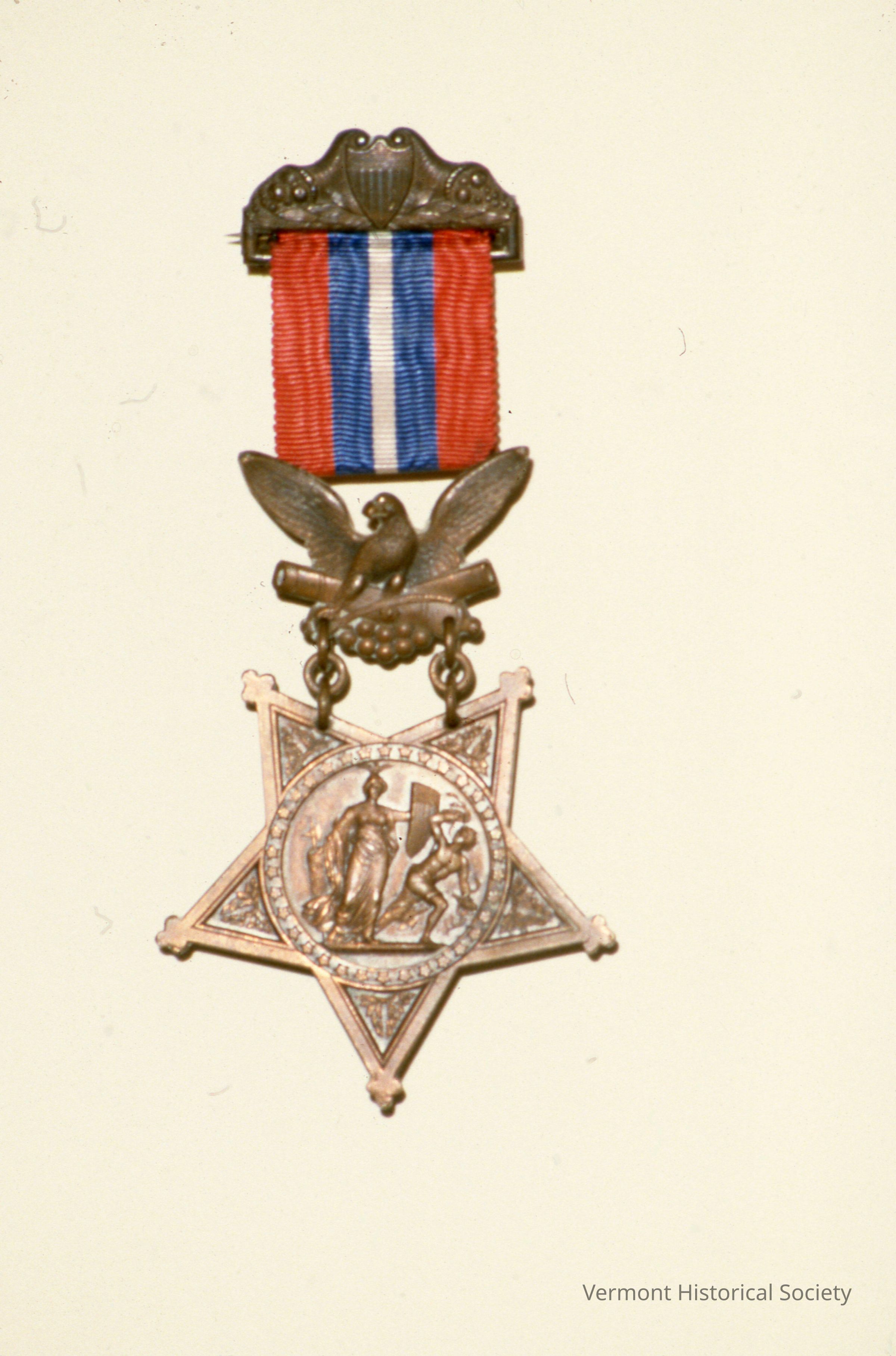 Bronze medal consisting of a top bar, silk ribbon, and two shaped metal portions. The bar is molded with an American shield and laurel leaves. A silk grosgrain ribbon hangs from that is striped red, blue, and white (from the outside in). From the ribbon hangs a metal spread eagle with crossed cannons. From that hangs a bronze star with an image of a woman in a toga beating a naked man with her shield. The back of the star is engraved with the inscription, "The Congress/ to/ Sergt. Robert/ I. Coffey/ Co.K 4th Vermont Vols./for distinguished/conduct at/ Bank's Ford, Va./ May 4/ 1863."Context