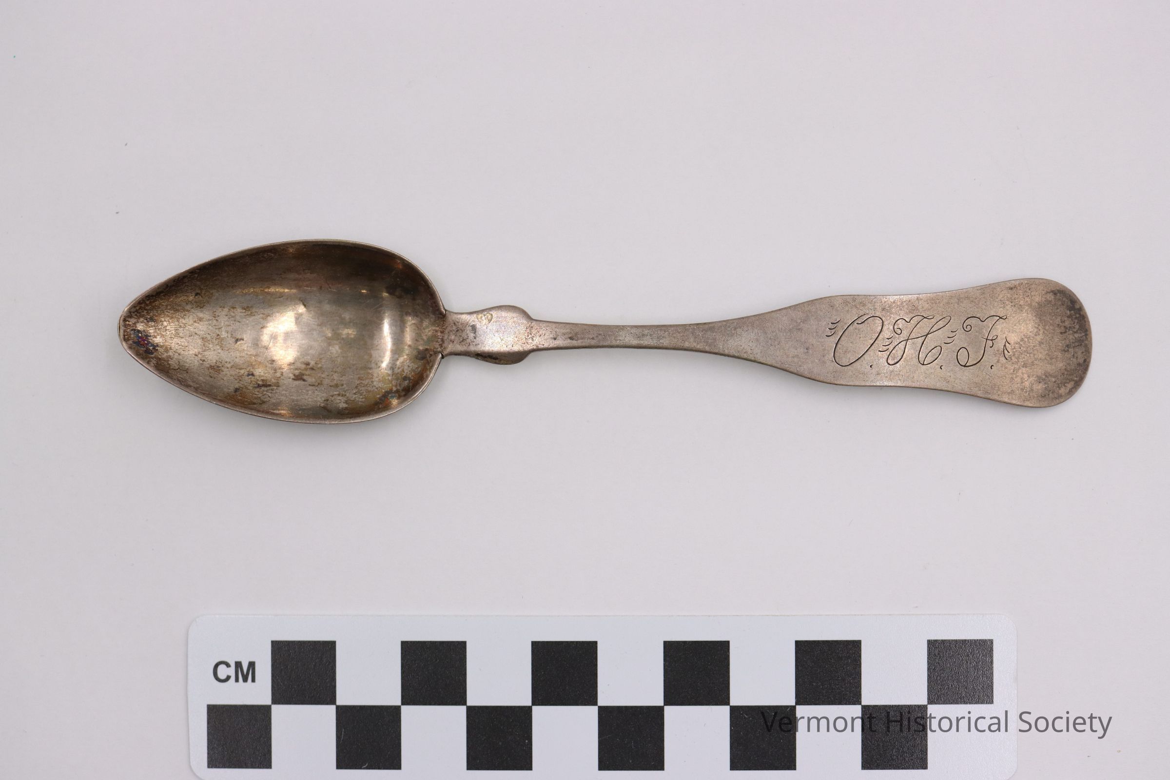 1 of a set of 7 silver teaspoons. The handle is engraved with the initials "O.H.F." The reverse is marked with the name "H. M. NICHOLS." inside a scalloped-edged rectangle.