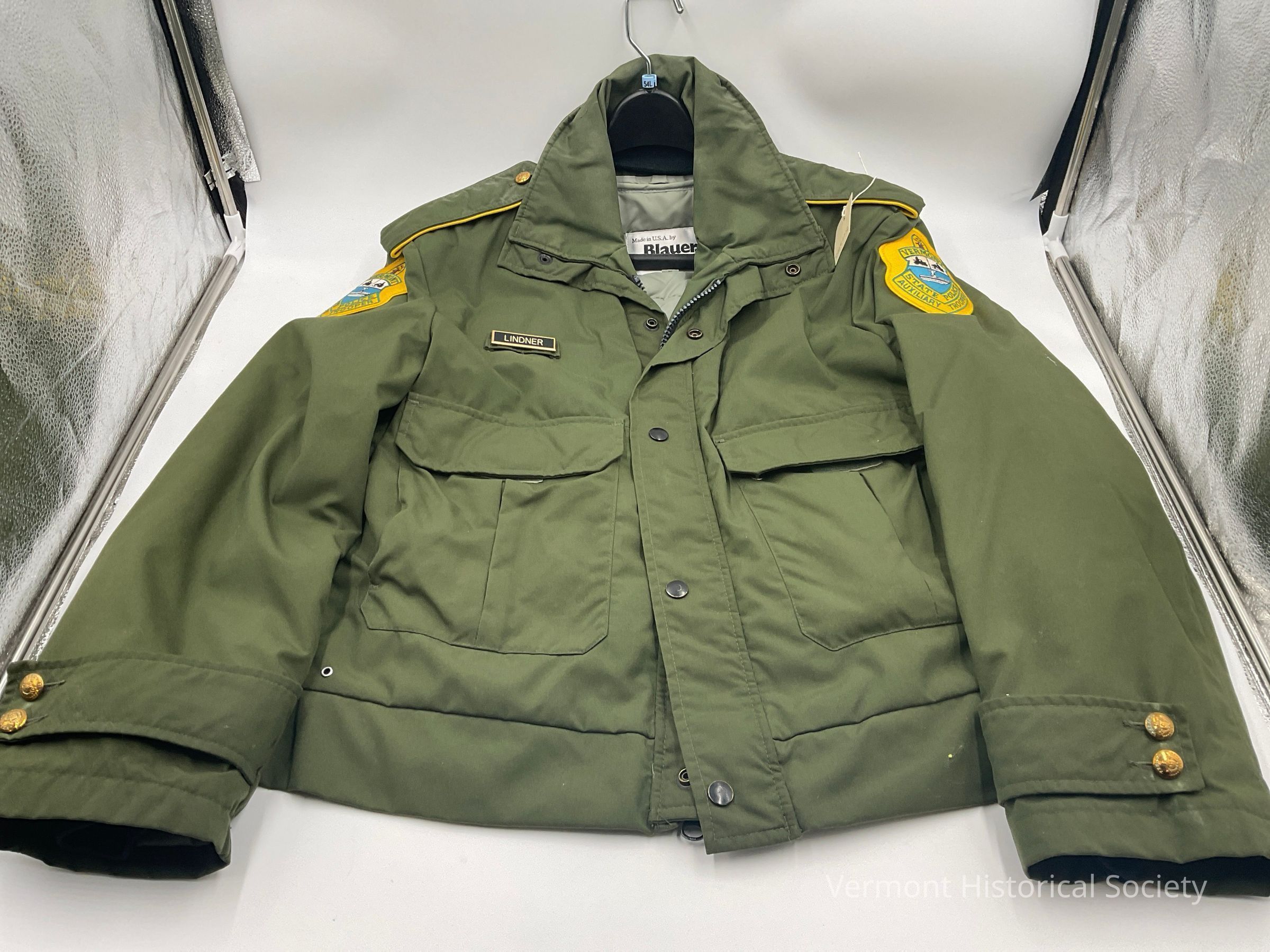 Green heavy jacket with zip-out lining. The jacket snaps and zips close up the front and has two front pockets and epaulets. Yellow patches on each shoulder read, "Vermont State Police Auxiliary Trooper. A black and white name tag is pinned to the right front of the jacket that says, "Lindner," the name of the donor.Acquisition