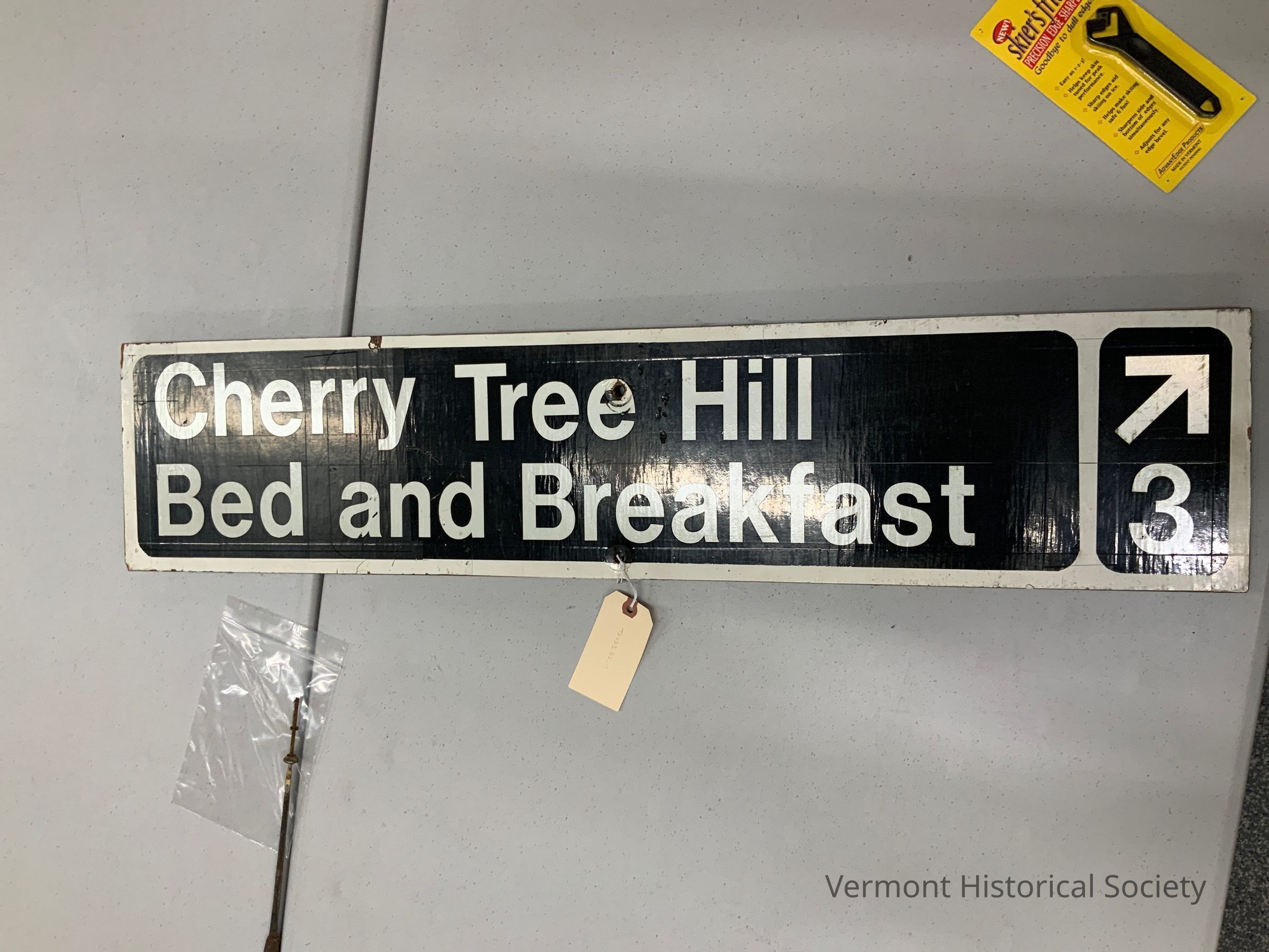 Black road sign with white lettering, directing one to, "Cherry Tree Hill Bed and Breakfast". On the right side, an arrow points northeast with the letter 3 under it, indicating the distance in miles to the bed and breakfast. The sign is single-sided with the other side being black.Context