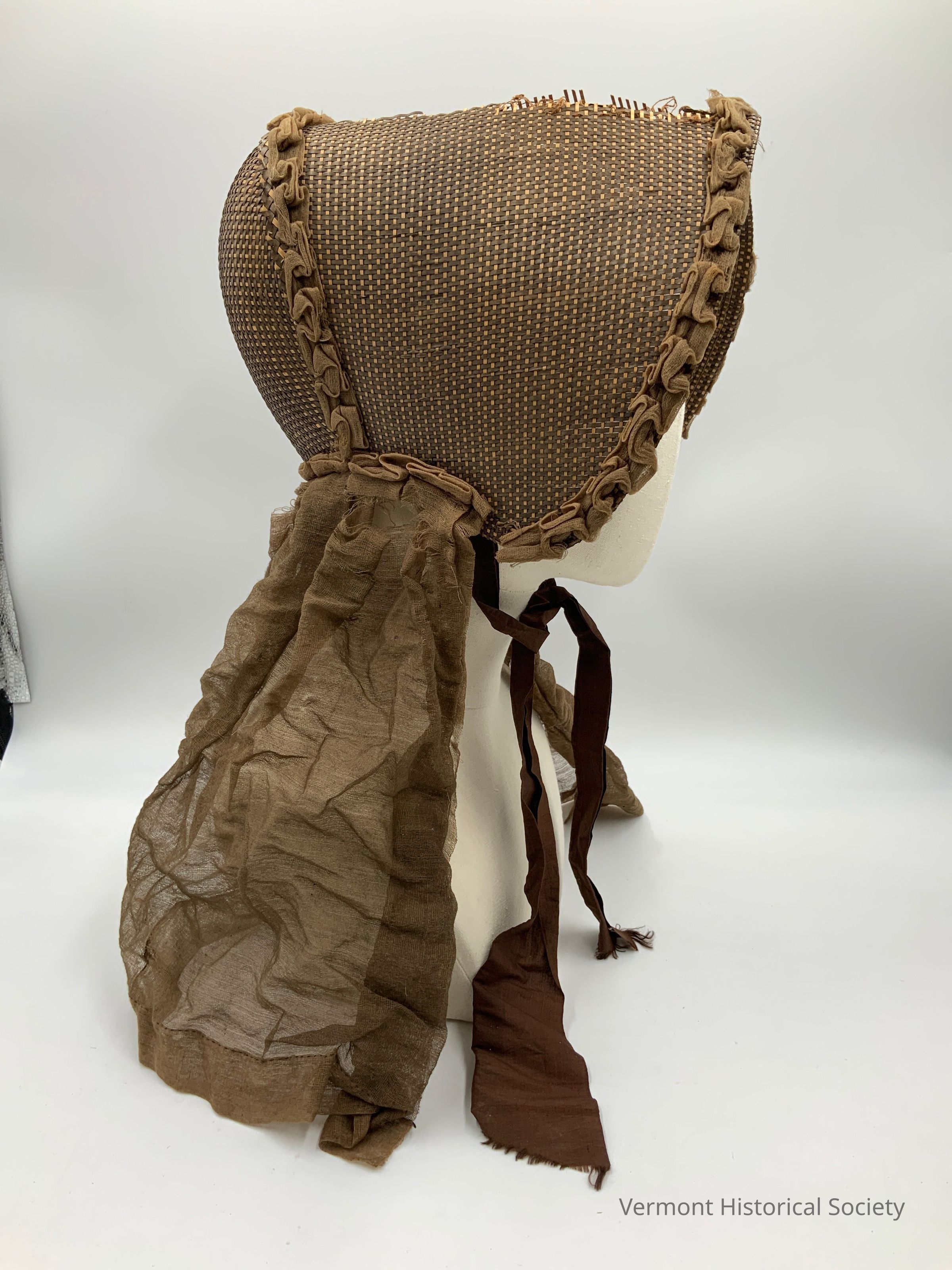 The sunbonnet has a straw brim and crown, which are woven in two shades of brown, giving it a dotted appearance. The brim is wide and is designed to shade the wearer's face from the sun. The crown of the bonnet is shallow, providing minimal room for hair. The edge of the brim and the seam with the crown are decorated with a brown gauze ruffle. The bonnet also has a wool gauze tail that hangs down to the wearer's shoulders, providing additional protection from the sun for the neck. To keep the bonnet in place, there are two brown taffeta ribbons that can be tied beneath the wearer's chin.