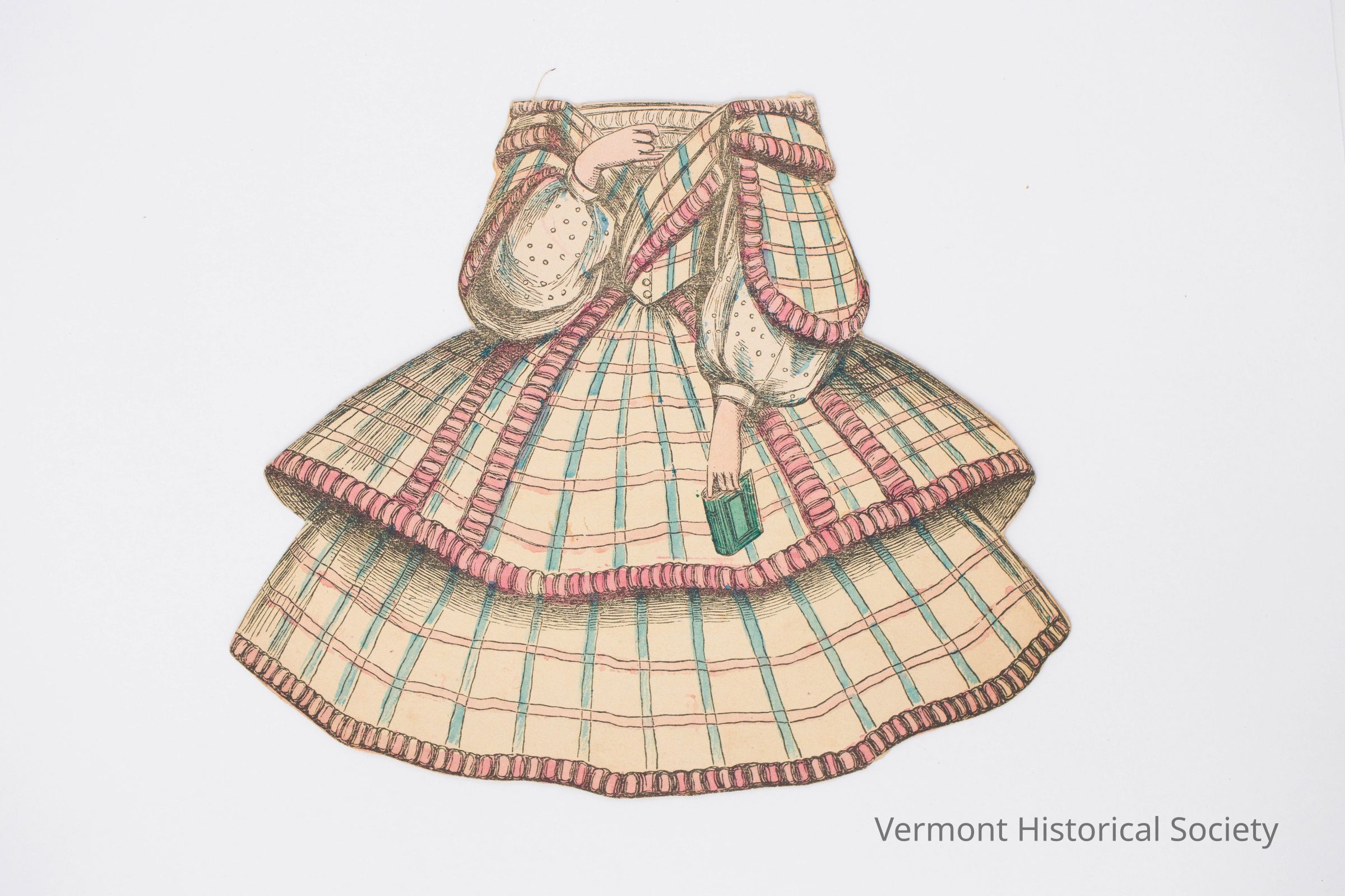 2-sided paper doll dress showing a blue, pink, and white plaid dress with voluminous skirt and wide sleeves. The dress sits off the shoulders. One of the hands is holding a small, green book.Context