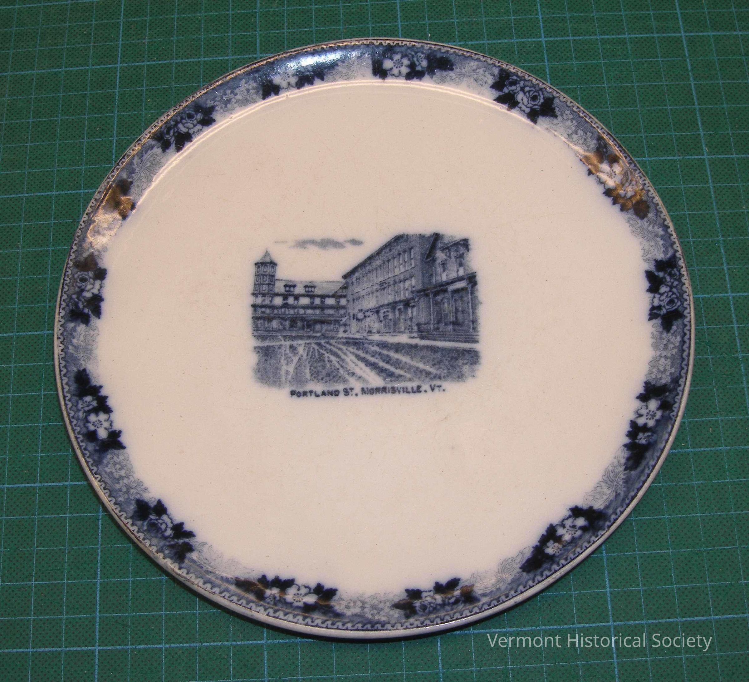 White ceramic plate printed in blue in the center with a scene of a city street line with commercial building. The image is labeled, "PORTLAND ST. MORRISVILL, VT." The rim is printed with a floral border. The bottom is marked "ADAMS SOUVENIR SERIES Made in England for A. R. Campbell. Morrisville, Vt."
