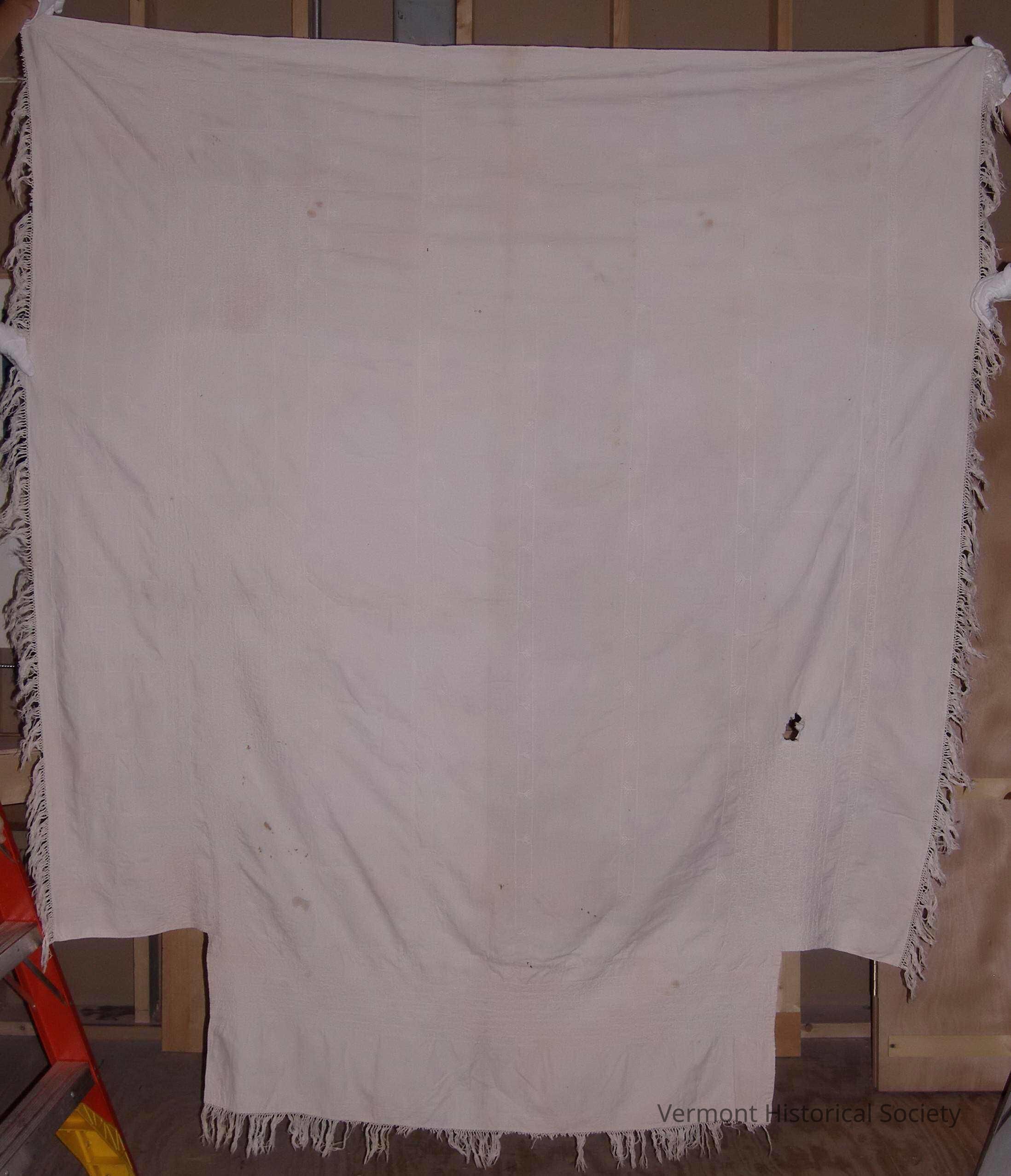 Amy Brackett Pike of Stowe, Vermont, is referred to in local histories as "Crazy Amy," and is said to have been diagnosed with "religious mania." Records indicate she spent only a short period at the Vermont Asylum in 1852, while she lived with and was cared for by her family through most of her adult life. This coverlet, embellished with extensive embroidered text of a religious and political nature, reveals the creator's disdain toward elected leaders and their perceived misuse of taxes and, most importantly, her desire to build a new temple dedicated to the Lord in her hometown of Stowe. While seemingly incoherent at first glance, upon closer reading it becomes clear that the text and few embroidered images on the coverlet convey a complex, consistent belief system.