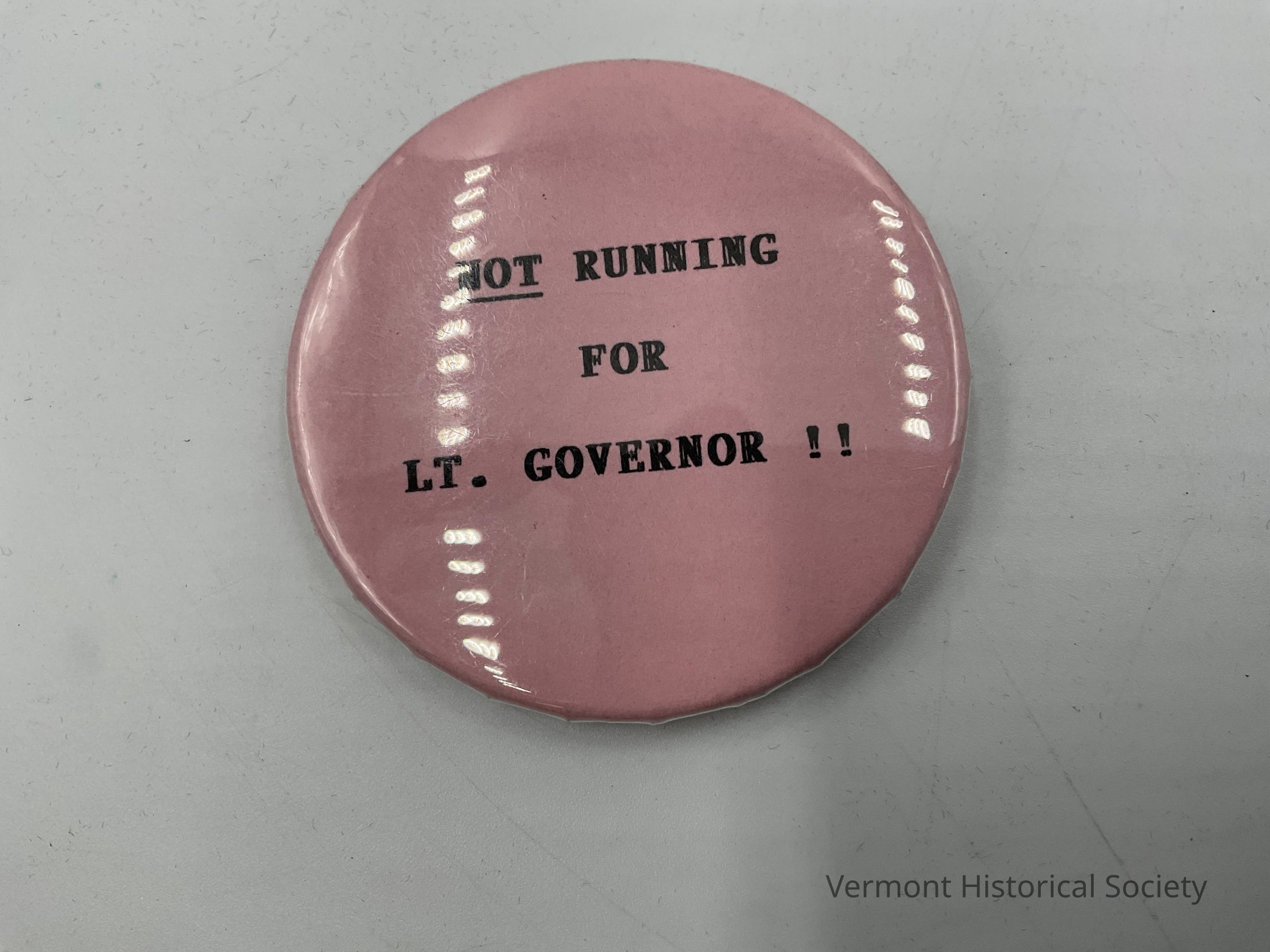 Round pink button. Written on the pin "NOT RUNNING FOR LT. GOVERNOR !!". The word "NOT" is underlined.