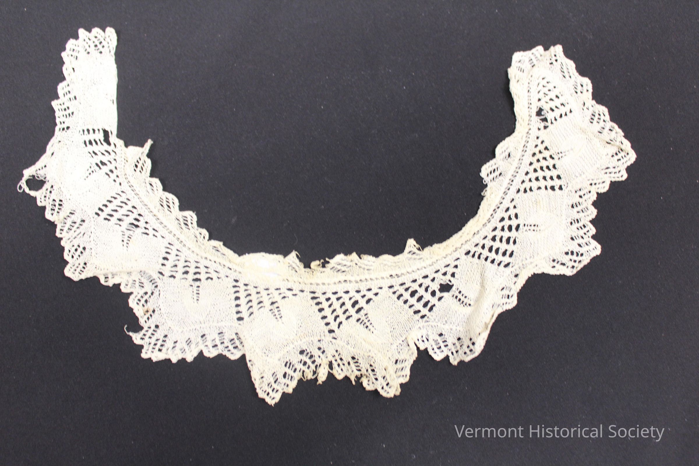 Round, knitted lace collar. The edge is scalloped and the design consists of diamond-shaped leaves.