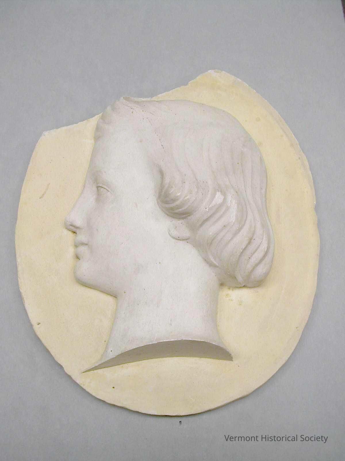 Plaster bas-relief showing a boys head in profile. He has a "page boy" bob: a bobbed haircut that is straight on the top and curled under at the ends. The bust is on an oval base, which has a portion missing at the top left. There is a wire loop affixed into the plaster at the center of the back.