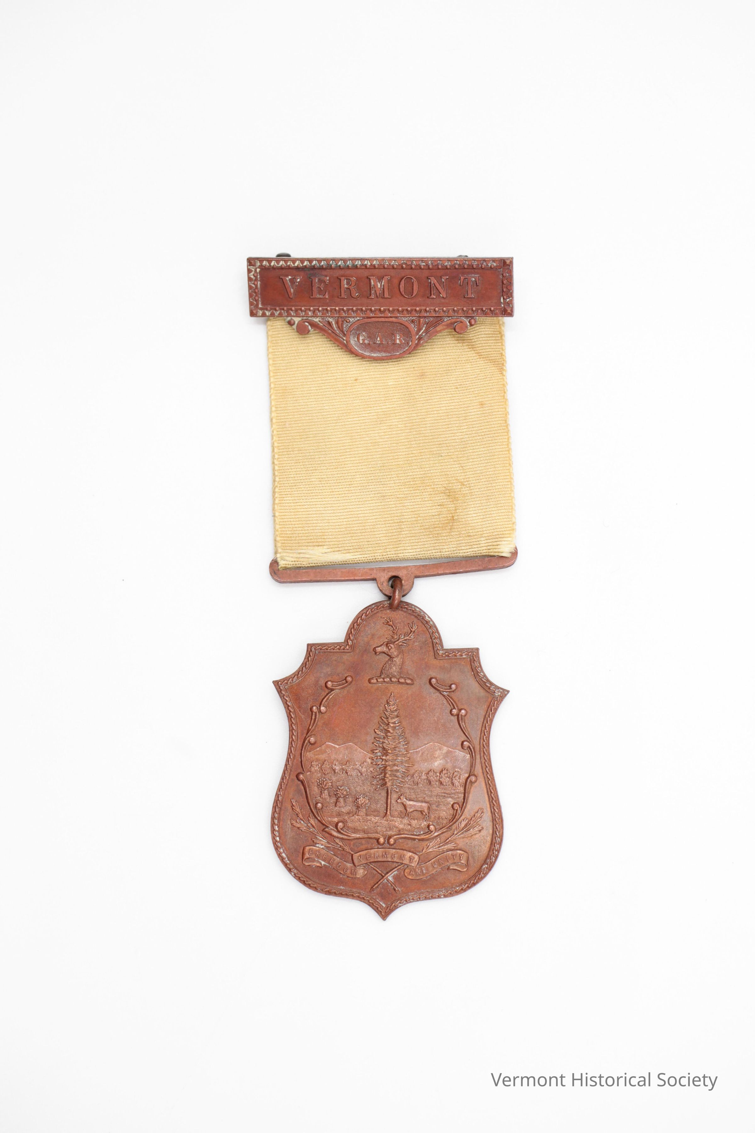 Membership ribbon consisting of a rectangular bar, a yellow ribbon, and a round medallion. The bronze bar has decorative scrollwork and the inscription, "VERMONT G.A.R." There is a hinged pin on the reverse. A yellow grosgrain ribbon is looped and stitched onto a wire on the back. From a bar looped through the bottom of a ribbon hangs a shield-shaped bronze medallion with the state seal of Vermont.